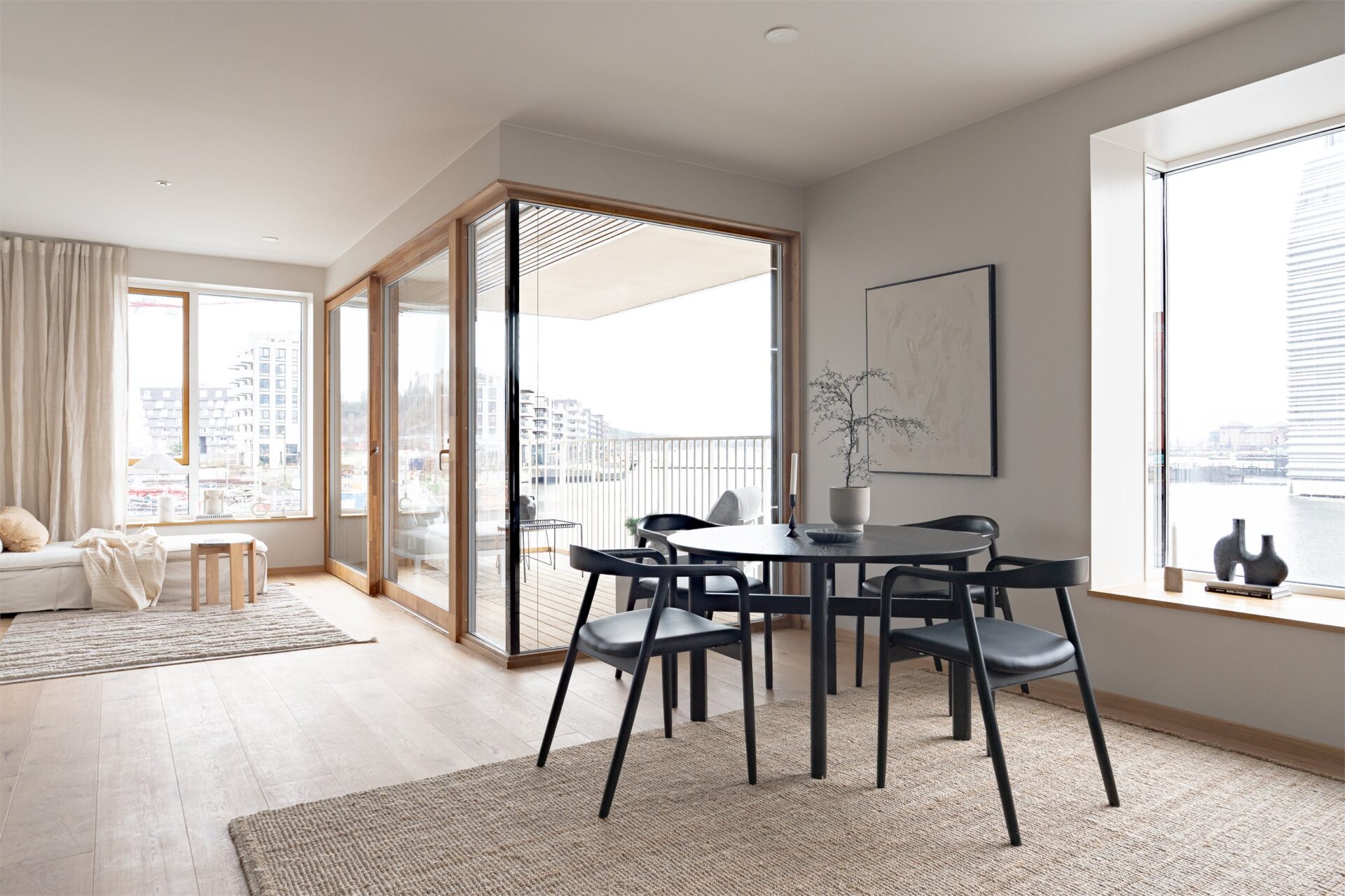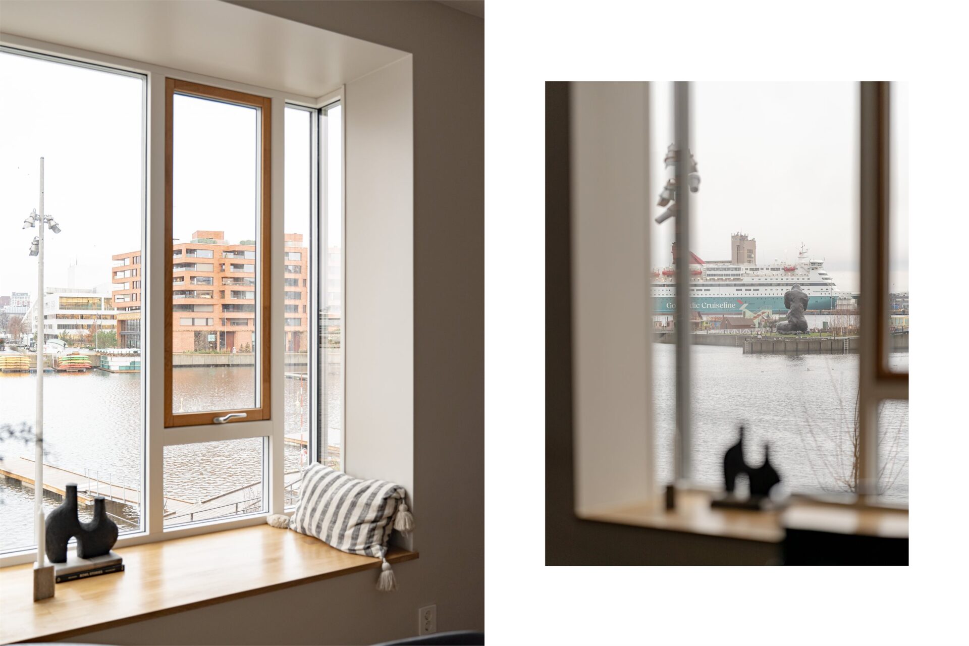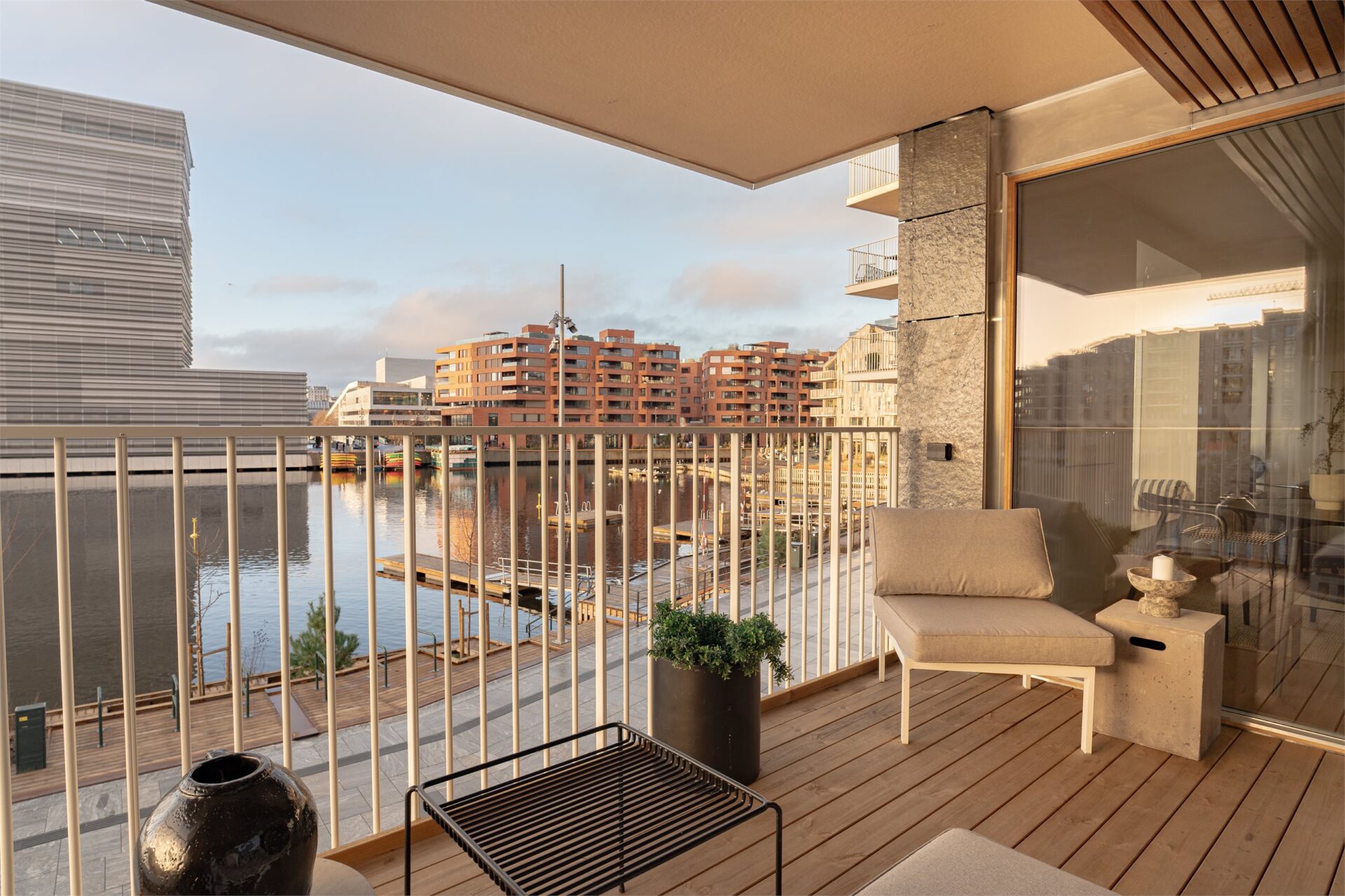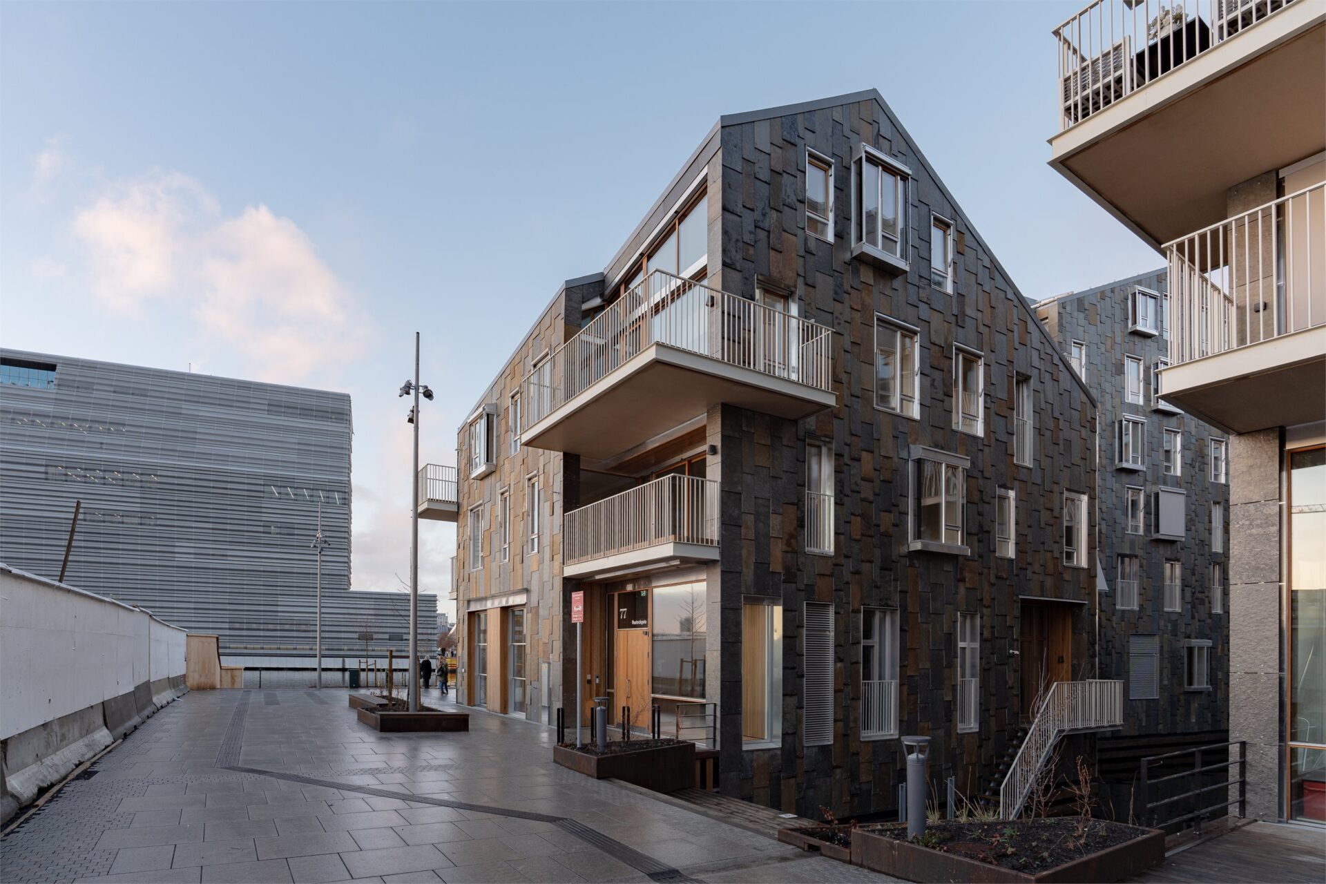 De fem punkthusene er bygget ut i sjøen, og fjorden ledes inn mellom husene. Vannspeil, smale broer og kanaler gir en intim stemning og maritim opplevelse.