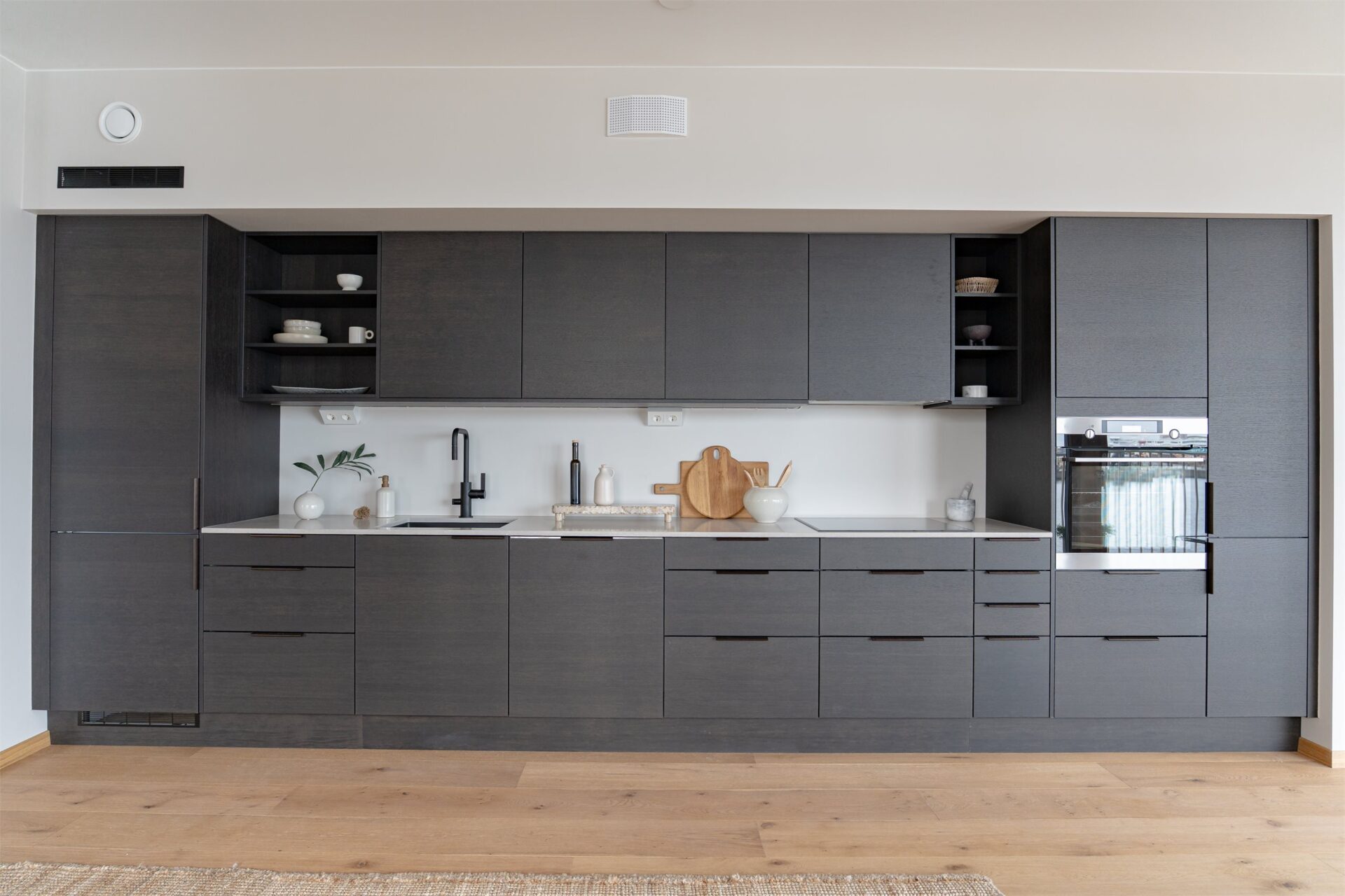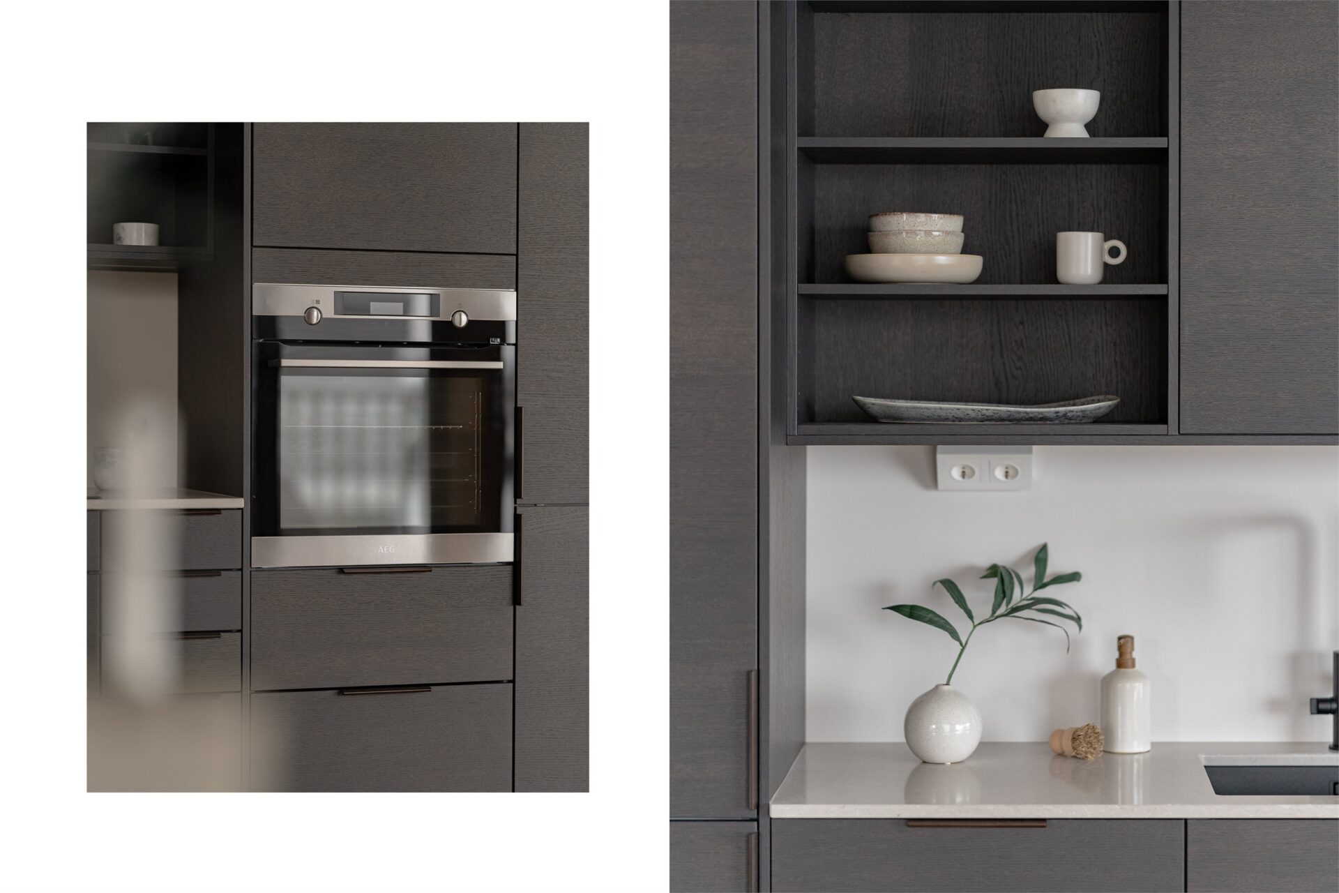 Fronter i sort eik finèr. Benkeplate i kompositt sten type Cæsarstone Clamshell 20 mm.