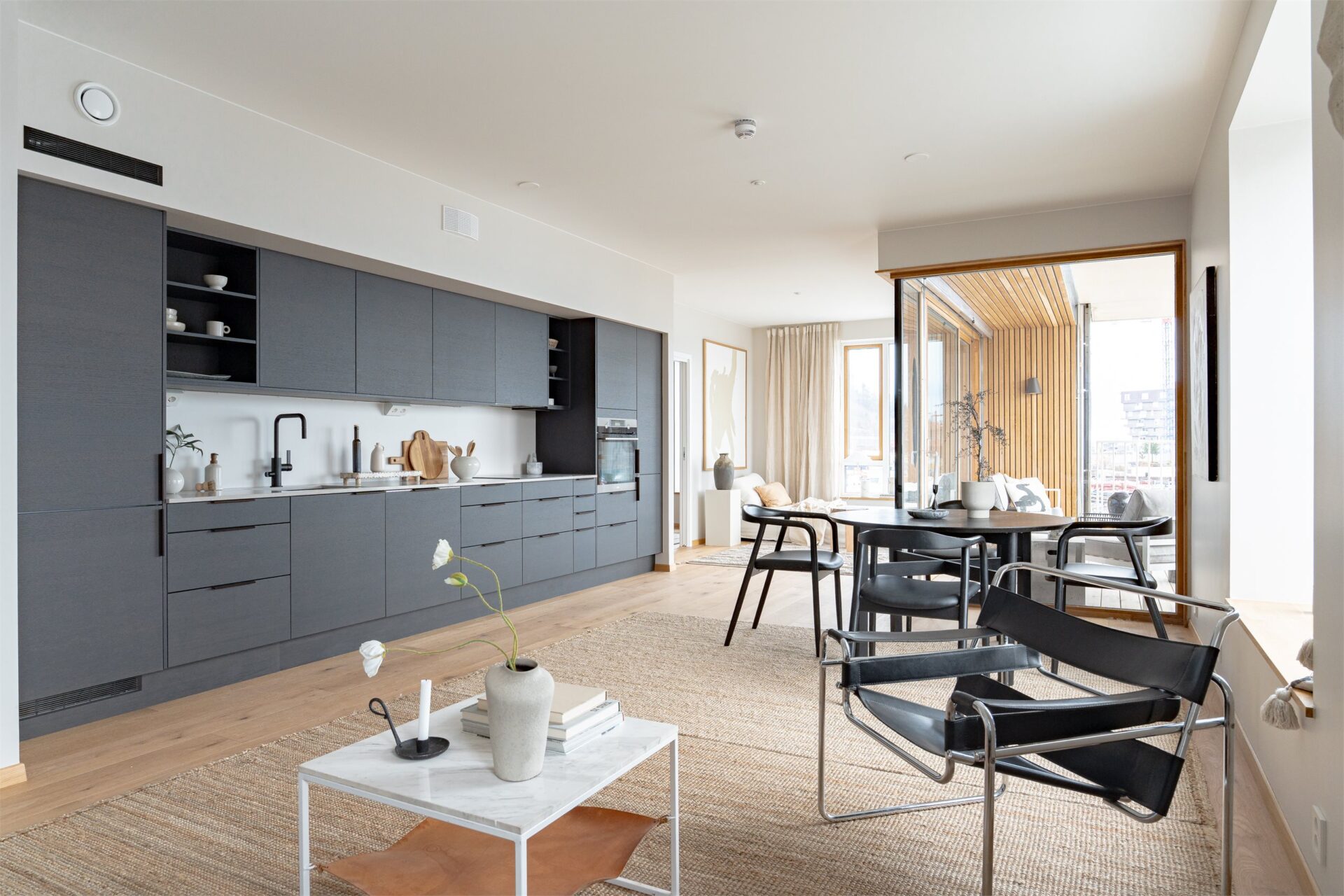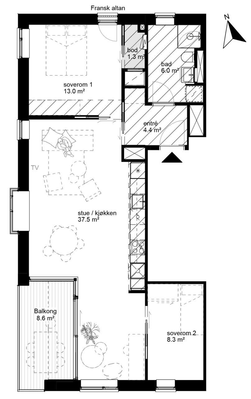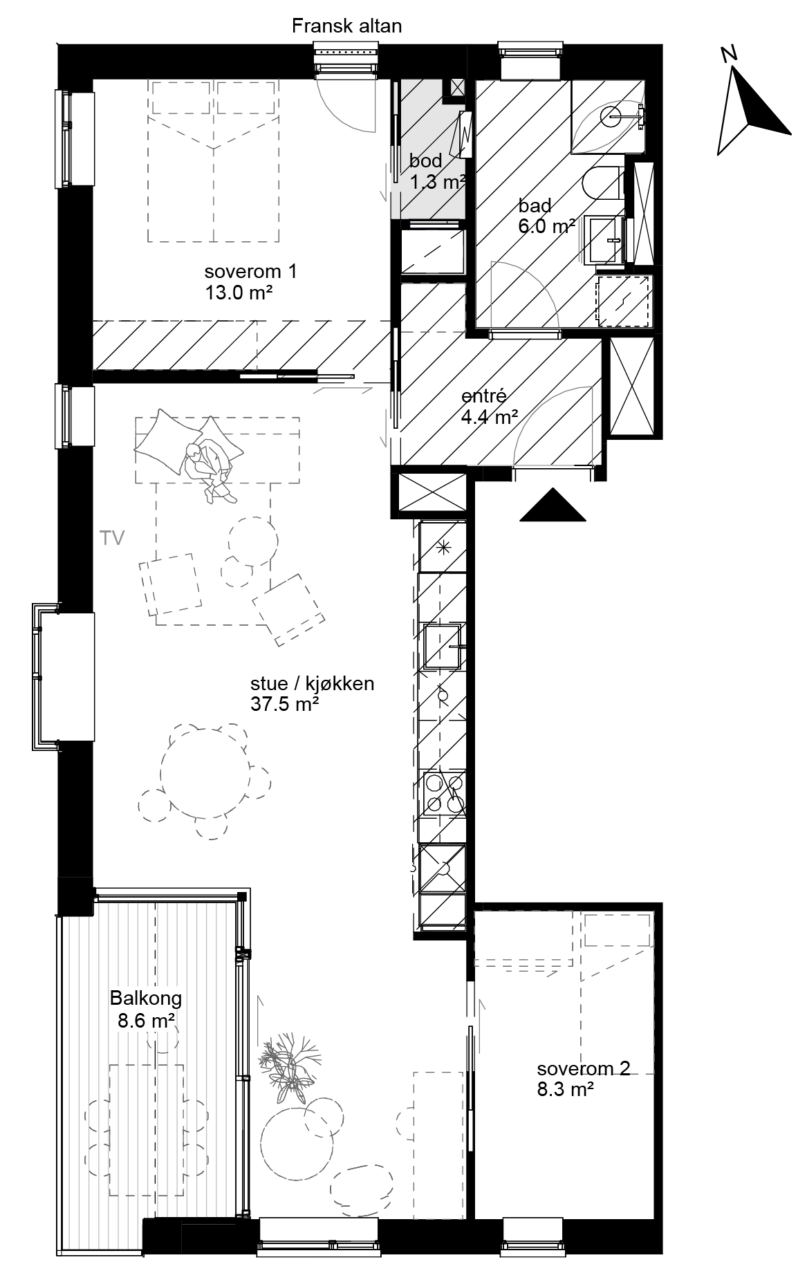 2-roms leiligheter leveres med 20 mm laminat benkeplate i hvit med vask type Franke Mythos Grafitt.