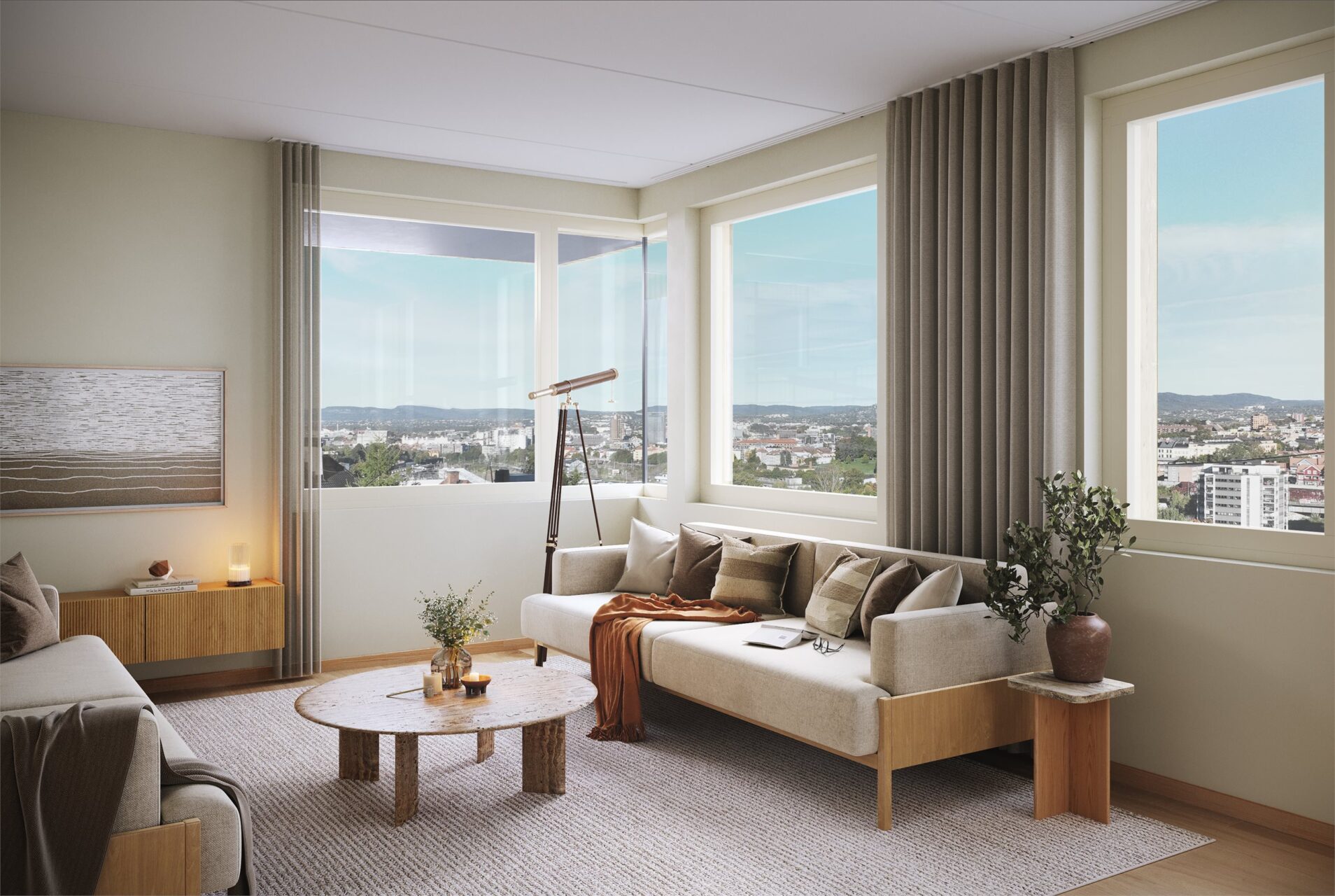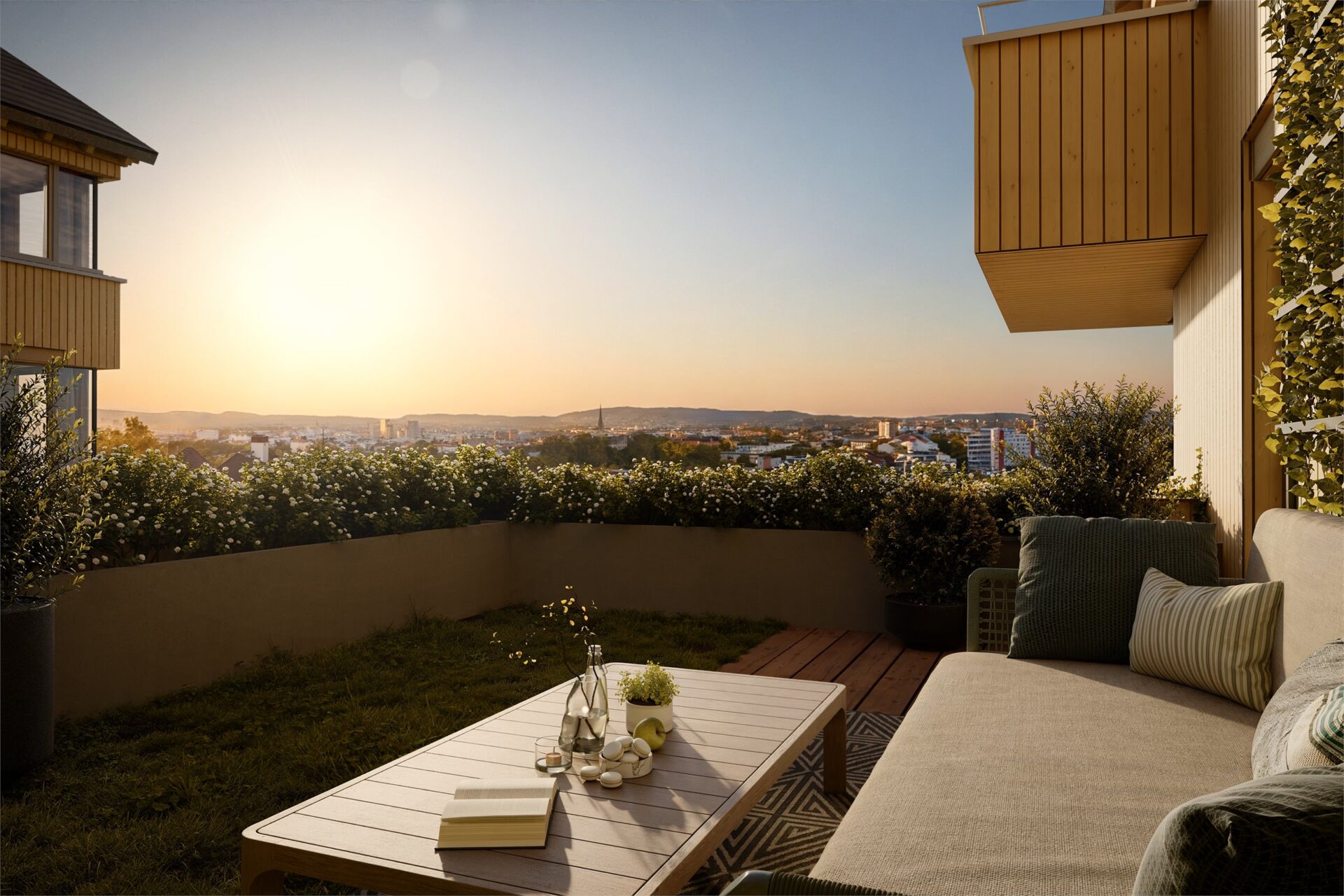 KONOWS HAGER|A201|Nydelig 4-roms frontleilighet med to uteplasser, fantastisk kveldssol og panoramautsikt over hele byen.