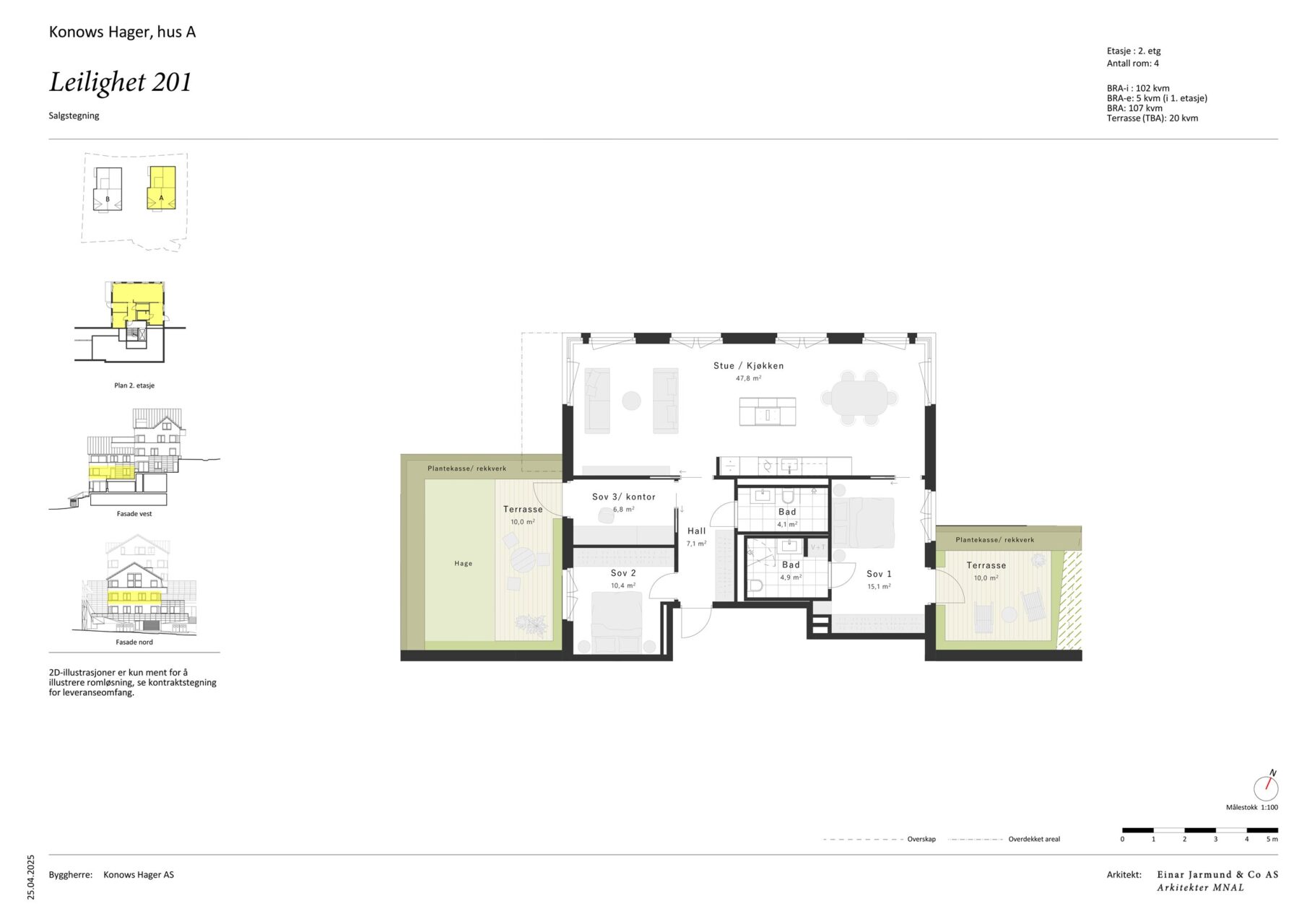 Kjøper er gjort kjent med at alle 3D-presentasjoner, digitale modeller, planer, skisser, bilder i prospekt, tilvalgspresentasjon og annet salgsmateriell er av illustrativ karakter, og utarbeidet før gjennomført detaljprosjektering. Materialet kan derfor vise bygningsvolumer, innredning, beplantning og detaljer mv. som ikke inngår i avtalen.