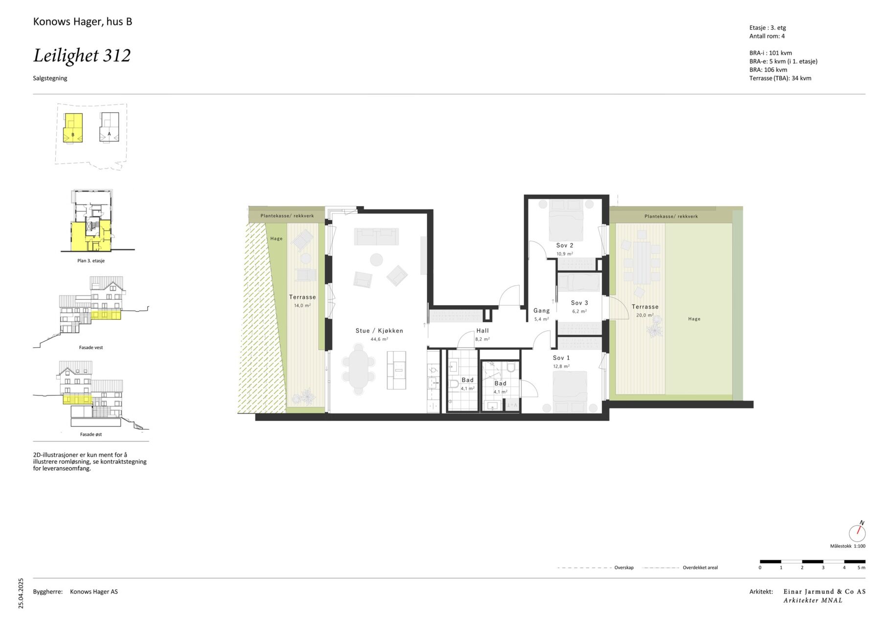 Tegninger og bilder i markedsføringsmateriell er kun illustrasjoner og kan avvike noe i forhold til plan – og fasadetegninger som vedlegges. Selger leverer ikke; innredninger, lamper, øvrig belysningsutstyr, markiser/solavskjerming, tepper, møbler og annet tilbehør, med mindre det fremgår av leveransebeskrivelse samt kontraktstegninger. 3D og VR-modellen er basert på skisser og regulert volum og kun ment som en illustrasjon. Endringer vil skje.