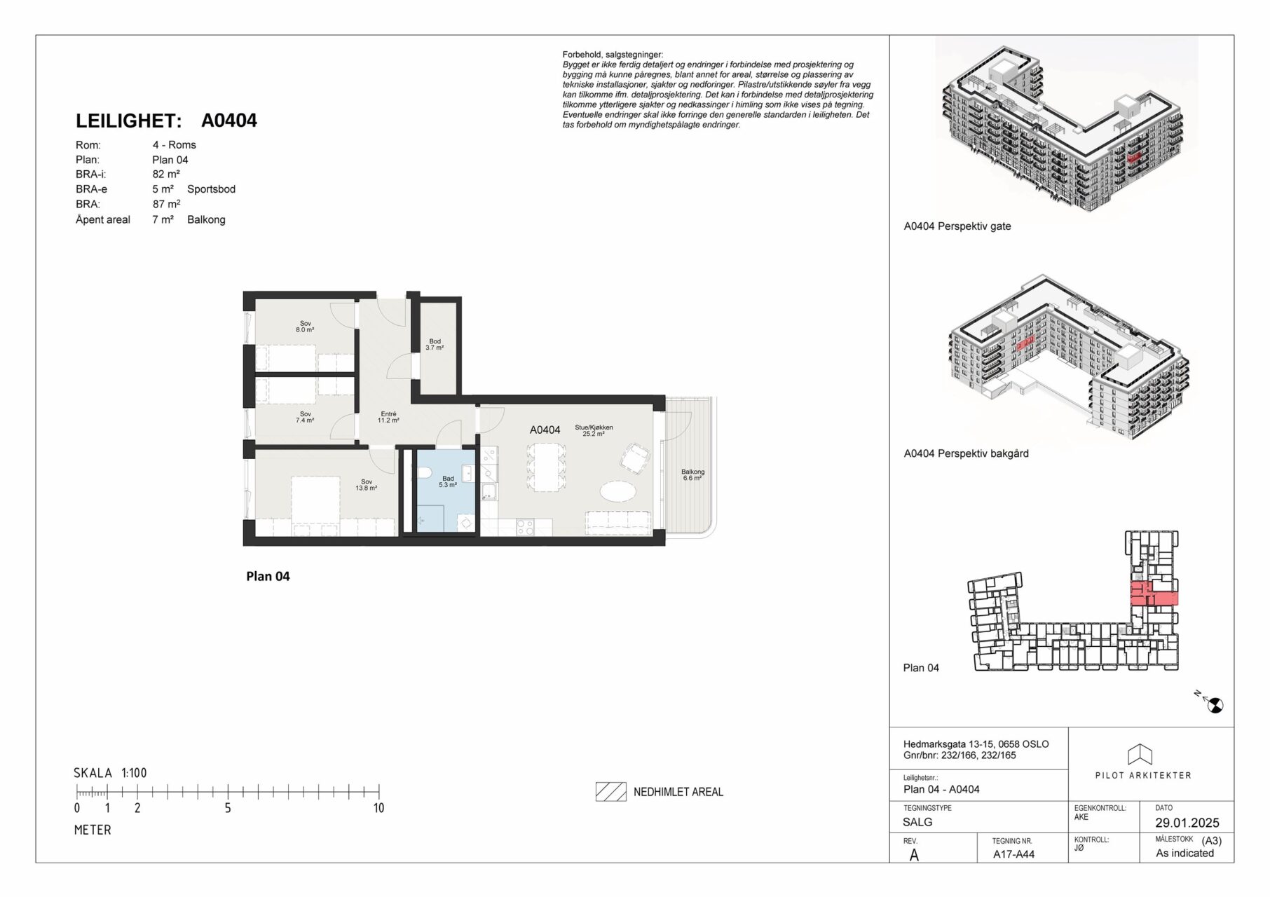 De oppgitte arealer er å betrakte som cirka-arealer. Arealer er beregnet og avrundet etter NS3940:2023, og alle arealer følger normal avrundingsregel og avrundes til nærmeste hele kvm. Som følge av avrundingsregelen vil leiligheter under 50 kvm Bra-i med bruksrett til sportsbod på 2,5 kvm ha oppgitt BRA-e (sportsbod) på 3 kvm på kontraktstegning. Det gjøres oppmerksom på at sportsboden som leveres er på 2,5 kvm for disse leilighetene. Leiligheter over 50 kvm leveres med sportsbod på 5 kvm som oppgitt på kontraktstegning.