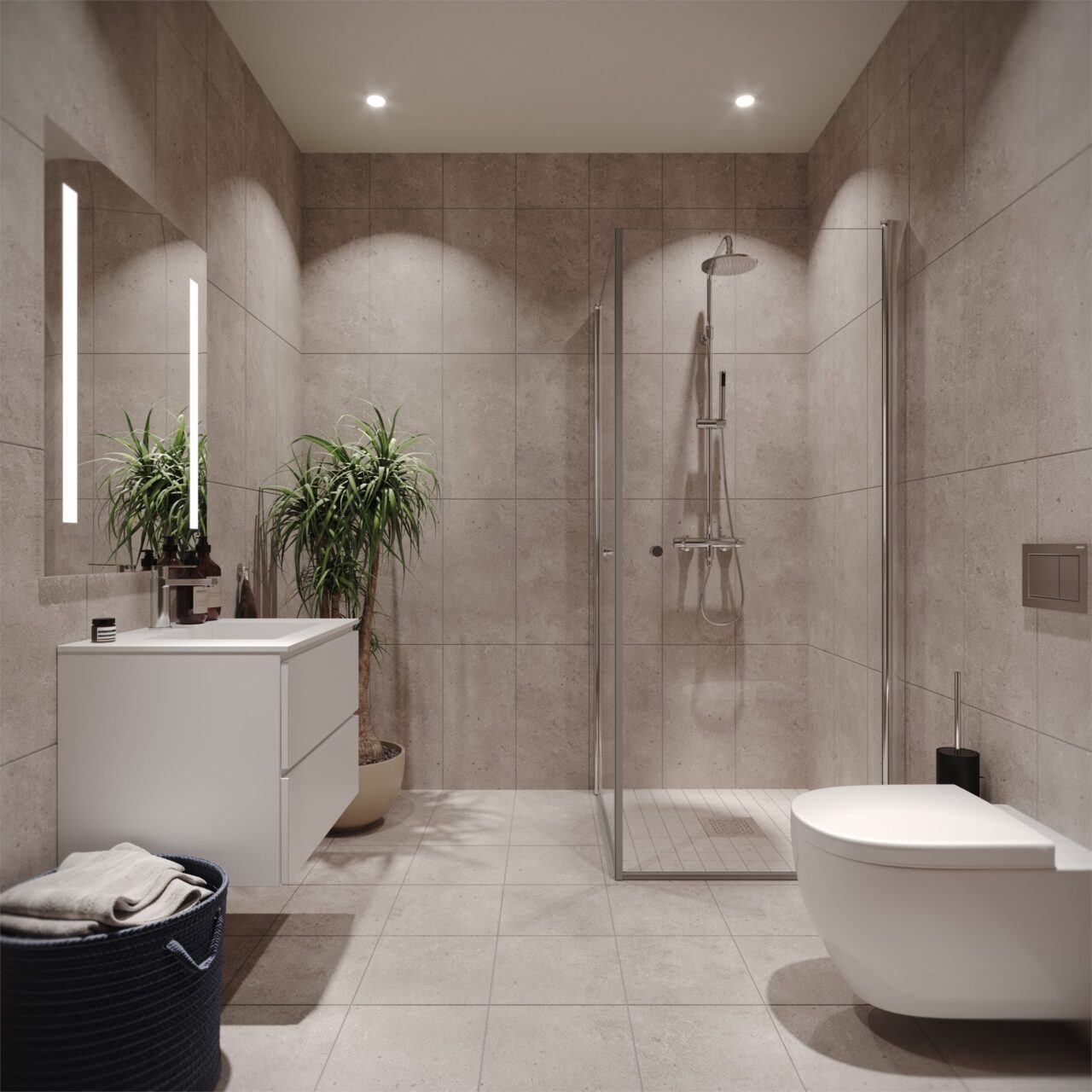 Alle bad leveres som plassbygde bad. Enkelte bad og wc-rom leveres med utenpåliggende/innkasset sisterne. De leiligheter dette gjelder fremgår av salgstegninger.