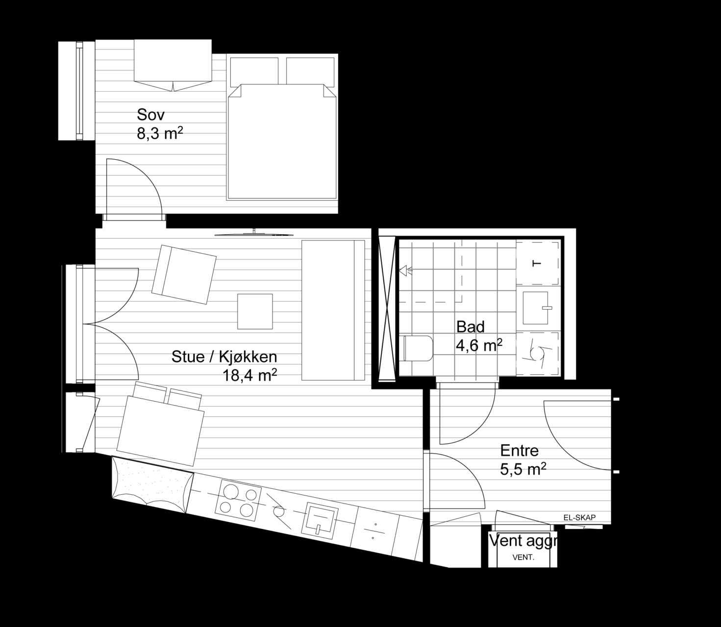 Det leveres kjøkken fra HTH eller Sigdal med integrerte hvitevarer, og omfanget av leveransen er iht. det som fremgår av leilighetsplanen. Detaljert kjøkkentegning vil bli oversendt kjøper i forbindelse med tilvalgprosessen. Kjøper kan uten ekstra kostnad velge mellom tre ulike kjøkkenfronter iht. prosjektets interiørkonsepter.