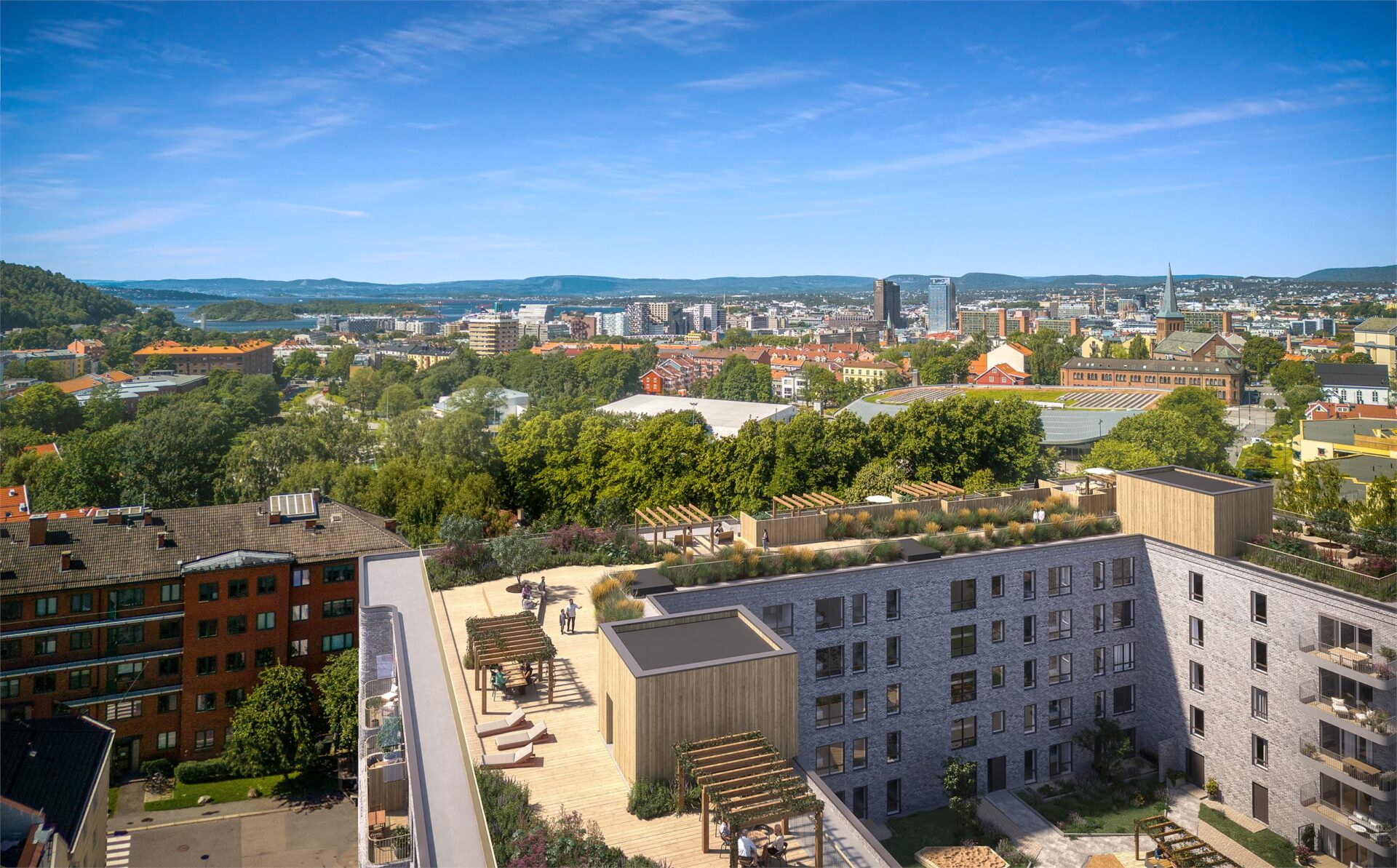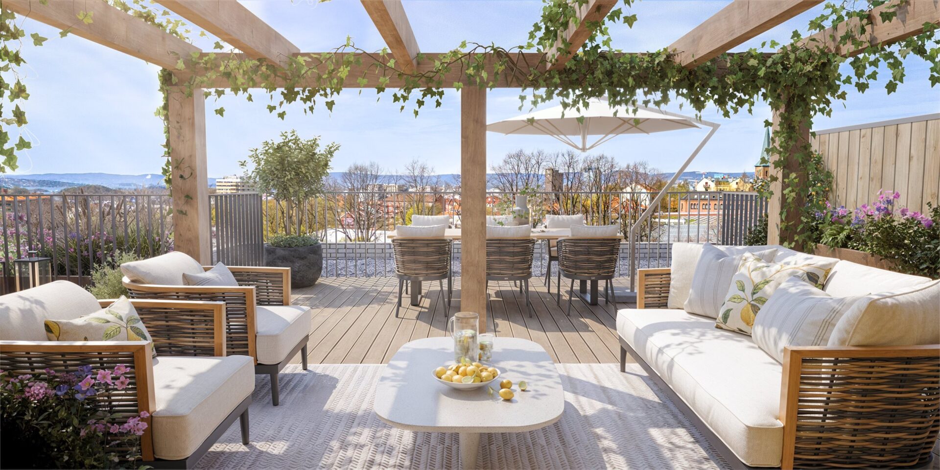 Et av prosjektets høydepunkter er takterrassen, hvor det er skapt et helt eget landskap i høyden. Det er lagt stor vekt på å bruke kvalitetsmaterialer som står godt mot vær og vind, og som samtidig gir en lun og innbydende atmosfære. Terrassene erinnrammet av grønne elementer – alt fra klatreplanter til blomstrende busker i plantekasser, noe som gir en følelse av nærhet til naturen selv i høyden. Dette er ikke bare en takterrasse, men en hage til alle beboerne med enestående utsikt over byens tak og horisont. Det er lagt opp til store fellesarealer på takene, samt egne private parseller. De private parsellene skjermes med levegger og klatreplanter, slik at de får en trivelig og intim atmosfære.