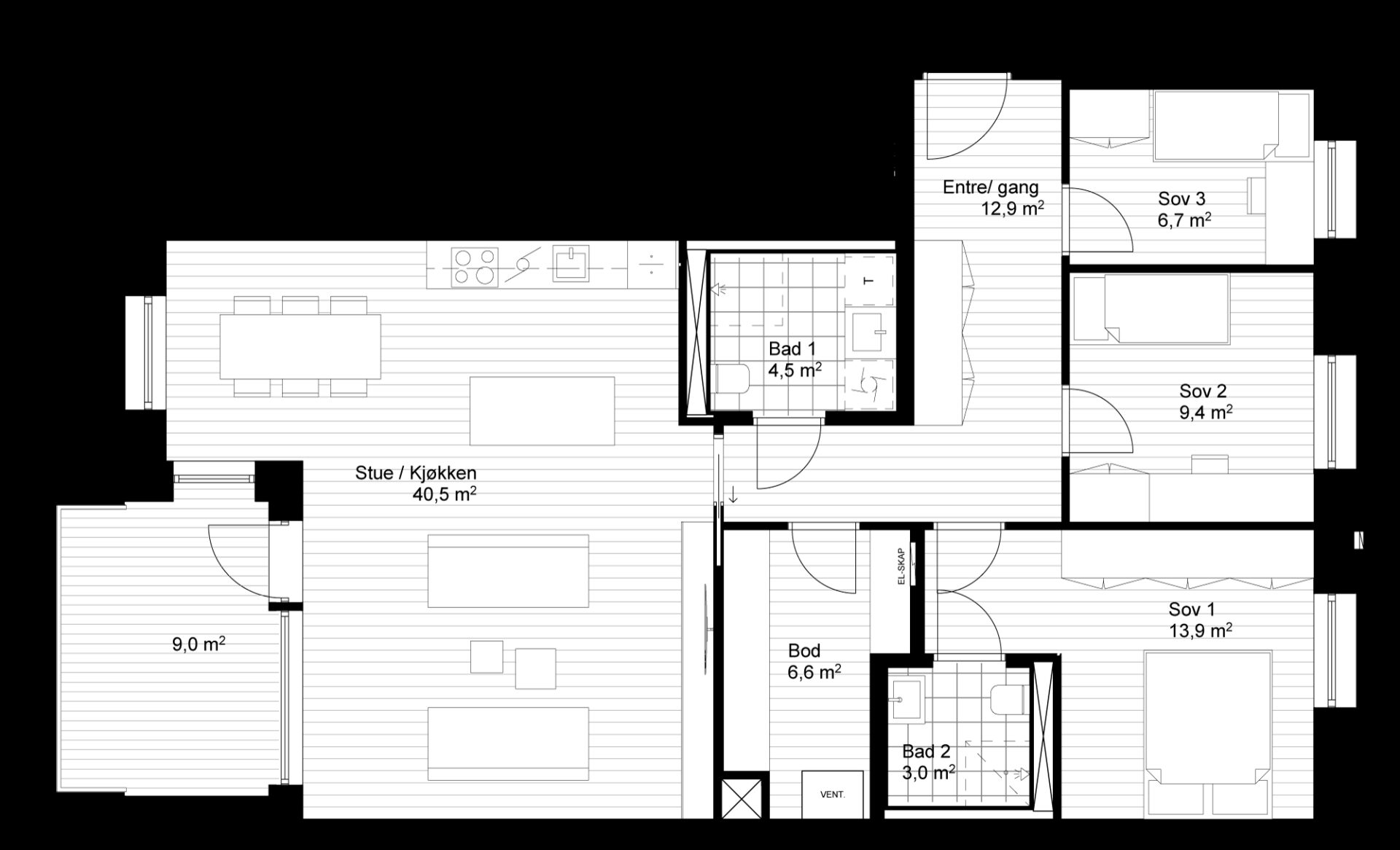 J301 er en stor og innholdsrik 4-roms selveierleilighet beliggende i 3. etasje. Leiligheten inneholder entré, 3 soverom og 2 flislagte bad. Hovedsoverommet har god plass for stor garderobeløsning, og ligger i tilknytning til privat bad. Videre er det er det en åpen stue/-kjøkkenløsning med egne soner for både spisebord og sofagruppe, i tillegg til kjøkkenøy med plass for barstoler.