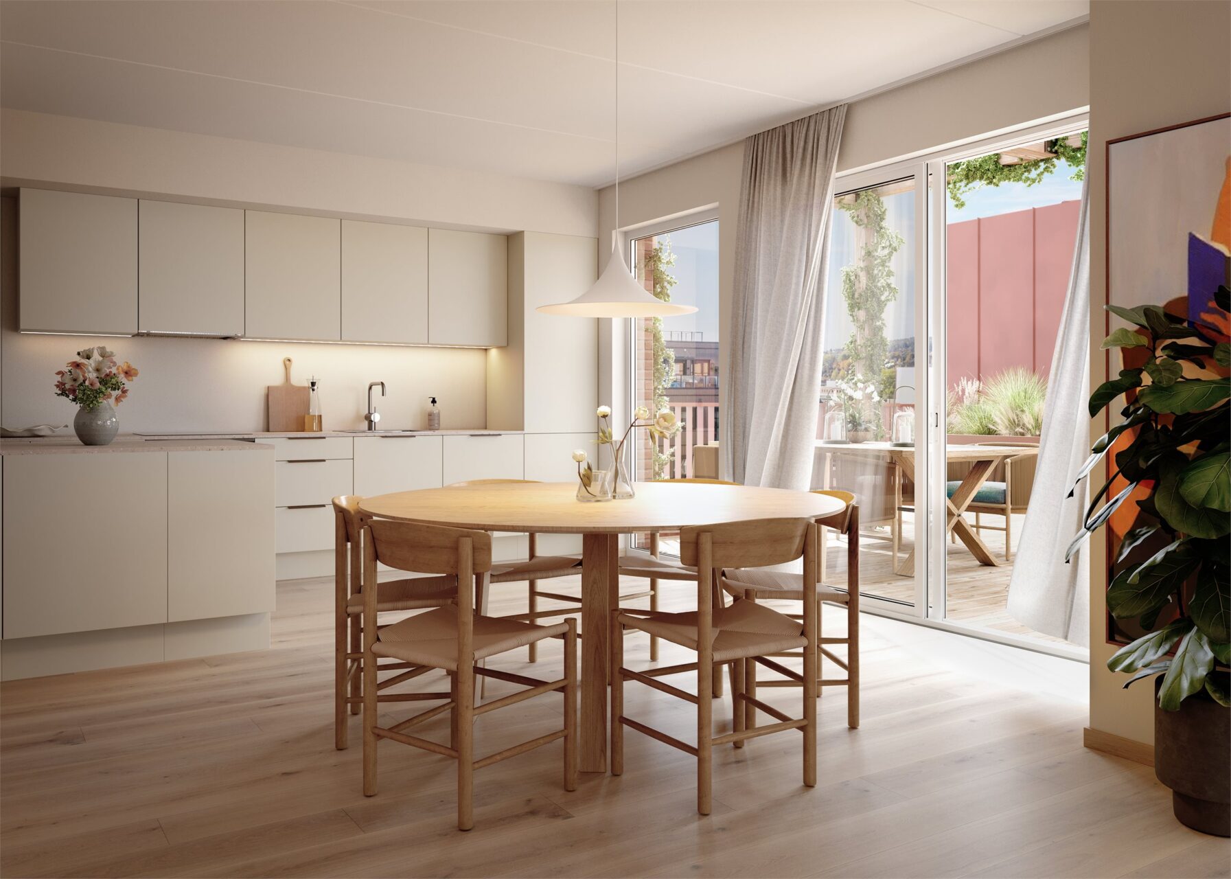 Vannbåren gulvvarme gir jevn og behagelig oppvarming, samtidig som det skaper et bedre inneklima og et stilrent uttrykk uten synlige radiatorer. Kjøkkenet leveres med sømløst integrerte hvitevarer, inkludert en selvrensende stekeovn for enkel rengjøring. De større leilighetene har vinduer både mot gaten og den grønne kvartalshagen, med stue og kjøkken i ett gjennomgående, åpent og luftig rom. Toppetasjene i lamellbygget mot Teatergata vil få en ekstra romfølelse med saltak og god takhøyde. Alle leilighetene vil få egen uteplass enten som balkong eller terrasse.