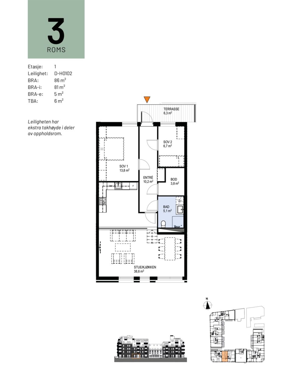 Arealet er beregnet ut fra Norsk standard NS 3940:2023. BRA-i: Internt arealet innenfor boligens omsluttende vegger, inkludert sjakt. BRA-e: Eksternt areal som boligen har eksklusiv bruksrett til, men som ikke ligger i boligen, f.eks. kjellerbod. BRA-b: Areal for innglasset balkong med veggareal. Total BRA = Summen av BRA-i, BRA-e og BRA-b. TBA er areal på terrasse og balkong. Arealet oppgis ved salg, men inngår ikke i BRA. Oppgitt romareal er netto romareal. De oppgitte arealer er å betrakte som cirka-arealer. Partene har ingen krav mot hverandre dersom arealet skulle vise seg å være 5 % mindre / større enn det oppgitte areal.
