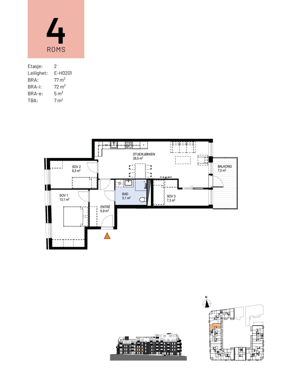 Arealet er beregnet ut fra Norsk standard NS 3940:2023. BRA-i: Internt arealet innenfor boligens omsluttende vegger, inkludert sjakt. BRA-e: Eksternt areal som boligen har eksklusiv bruksrett til, men som ikke ligger i boligen, f.eks. kjellerbod. BRA-b: Areal for innglasset balkong med veggareal. Total BRA = Summen av BRA-i, BRA-e og BRA-b. TBA er areal på terrasse og balkong. Arealet oppgis ved salg, men inngår ikke i BRA. Oppgitt romareal er netto romareal. De oppgitte arealer er å betrakte som cirka-arealer. Partene har ingen krav mot hverandre dersom arealet skulle vise seg å være 5 % mindre / større enn det oppgitte areal.