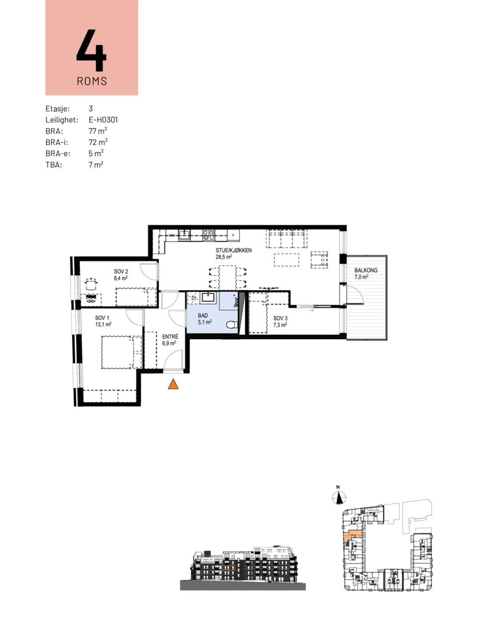Arealet er beregnet ut fra Norsk standard NS 3940:2023. BRA-i: Internt arealet innenfor boligens omsluttende vegger, inkludert sjakt. BRA-e: Eksternt areal som boligen har eksklusiv bruksrett til, men som ikke ligger i boligen, f.eks. kjellerbod. BRA-b: Areal for innglasset balkong med veggareal. Total BRA = Summen av BRA-i, BRA-e og BRA-b. TBA er areal på terrasse og balkong. Arealet oppgis ved salg, men inngår ikke i BRA. Oppgitt romareal er netto romareal. De oppgitte arealer er å betrakte som cirka-arealer. Partene har ingen krav mot hverandre dersom arealet skulle vise seg å være 5 % mindre / større enn det oppgitte areal.