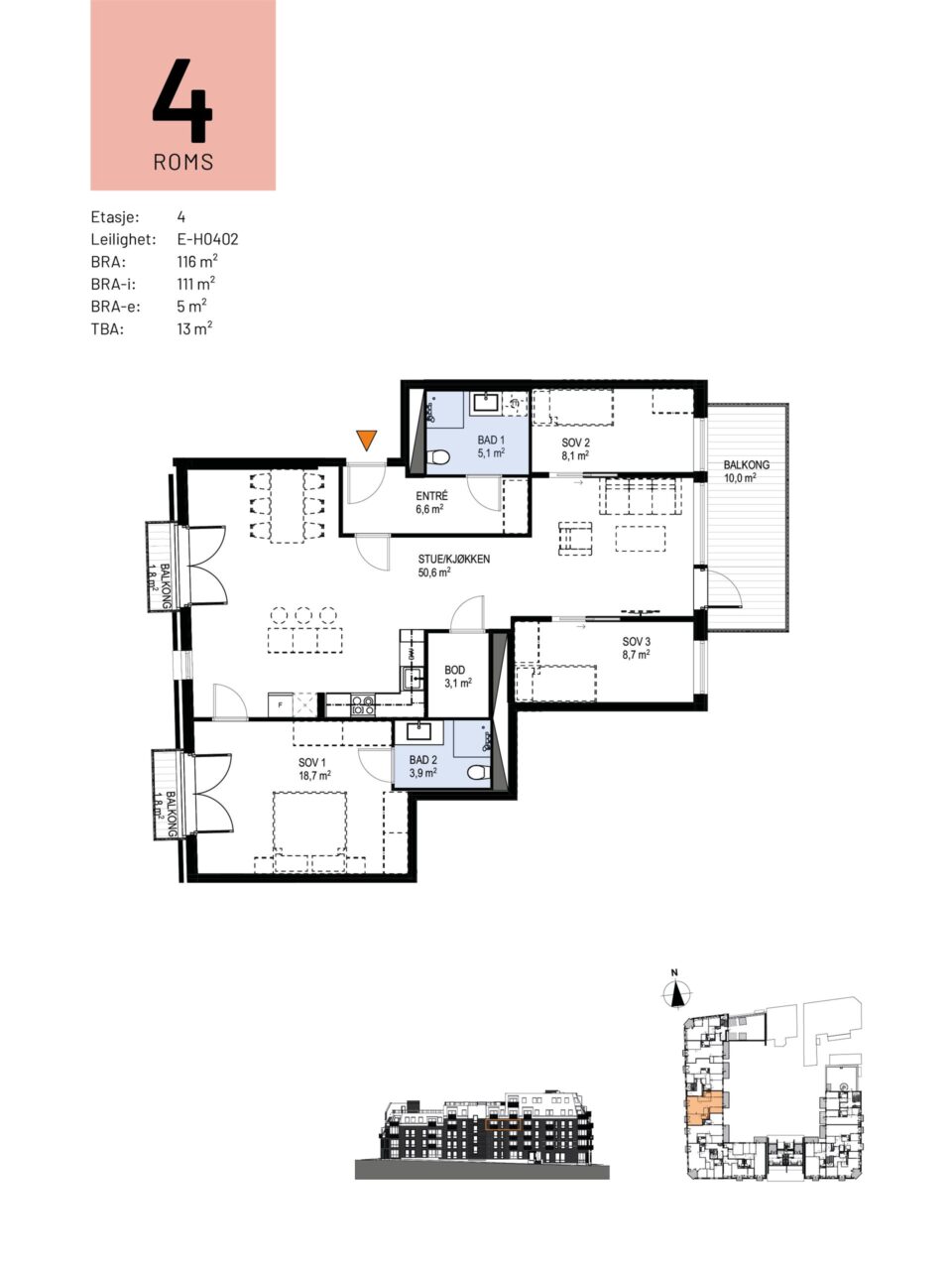 Arealet er beregnet ut fra Norsk standard NS 3940:2023. BRA-i: Internt arealet innenfor boligens omsluttende vegger, inkludert sjakt. BRA-e: Eksternt areal som boligen har eksklusiv bruksrett til, men som ikke ligger i boligen, f.eks. kjellerbod. BRA-b: Areal for innglasset balkong med veggareal. Total BRA = Summen av BRA-i, BRA-e og BRA-b. TBA er areal på terrasse og balkong. Arealet oppgis ved salg, men inngår ikke i BRA. Oppgitt romareal er netto romareal. De oppgitte arealer er å betrakte som cirka-arealer. Partene har ingen krav mot hverandre dersom arealet skulle vise seg å være 5 % mindre / større enn det oppgitte areal.