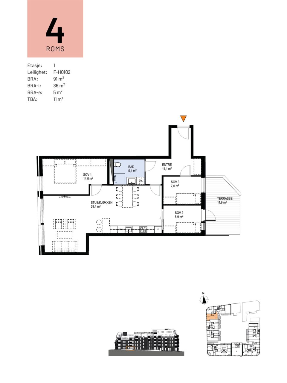 Arealet er beregnet ut fra Norsk standard NS 3940:2023. BRA-i: Internt arealet innenfor boligens omsluttende vegger, inkludert sjakt. BRA-e: Eksternt areal som boligen har eksklusiv bruksrett til, men som ikke ligger i boligen, f.eks. kjellerbod. BRA-b: Areal for innglasset balkong med veggareal. Total BRA = Summen av BRA-i, BRA-e og BRA-b. TBA er areal på terrasse og balkong. Arealet oppgis ved salg, men inngår ikke i BRA. Oppgitt romareal er netto romareal. De oppgitte arealer er å betrakte som cirka-arealer. Partene har ingen krav mot hverandre dersom arealet skulle vise seg å være 5 % mindre / større enn det oppgitte areal.