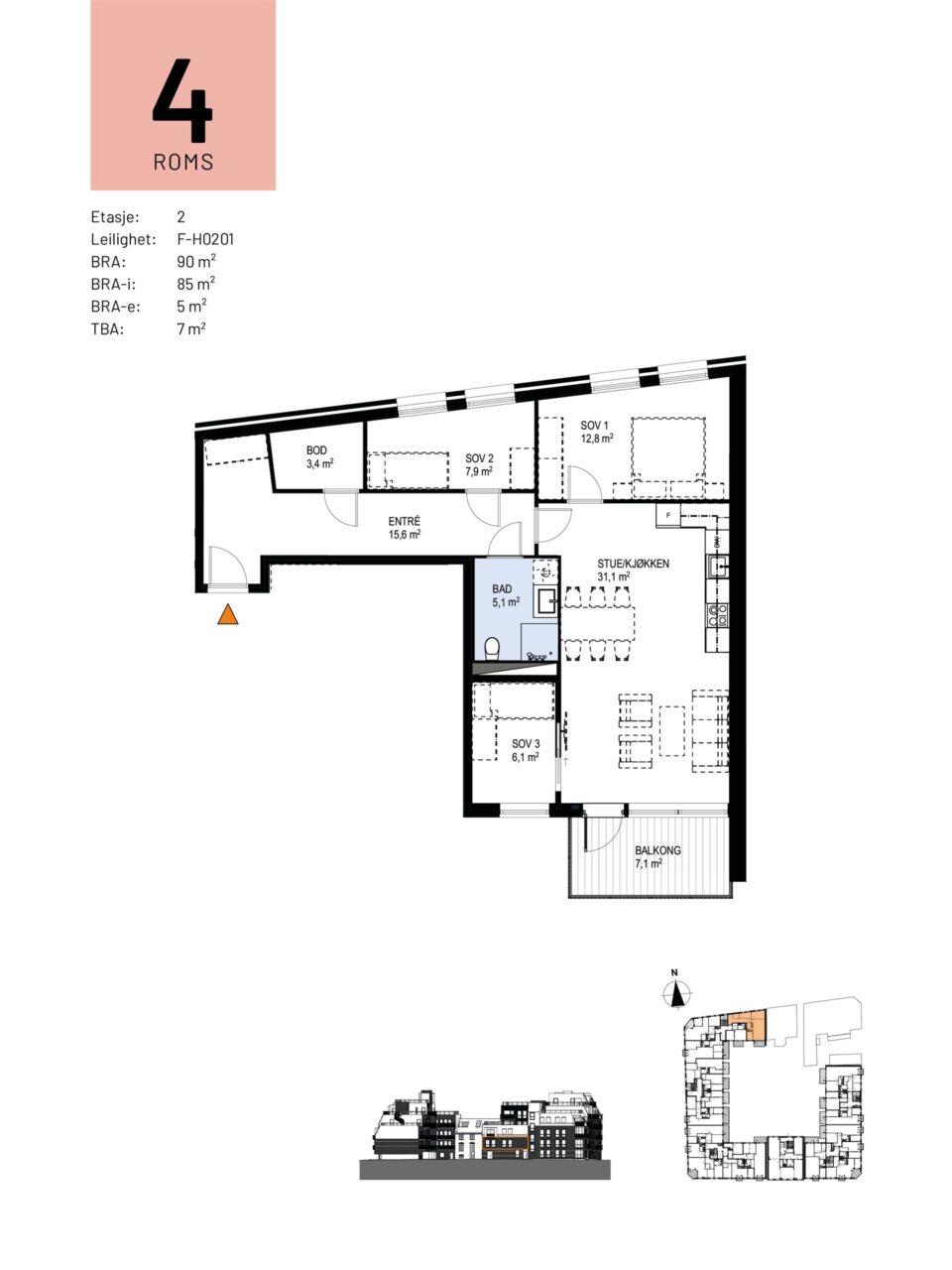 Arealet er beregnet ut fra Norsk standard NS 3940:2023. BRA-i: Internt arealet innenfor boligens omsluttende vegger, inkludert sjakt. BRA-e: Eksternt areal som boligen har eksklusiv bruksrett til, men som ikke ligger i boligen, f.eks. kjellerbod. BRA-b: Areal for innglasset balkong med veggareal. Total BRA = Summen av BRA-i, BRA-e og BRA-b. TBA er areal på terrasse og balkong. Arealet oppgis ved salg, men inngår ikke i BRA. Oppgitt romareal er netto romareal. De oppgitte arealer er å betrakte som cirka-arealer. Partene har ingen krav mot hverandre dersom arealet skulle vise seg å være 5 % mindre / større enn det oppgitte areal.