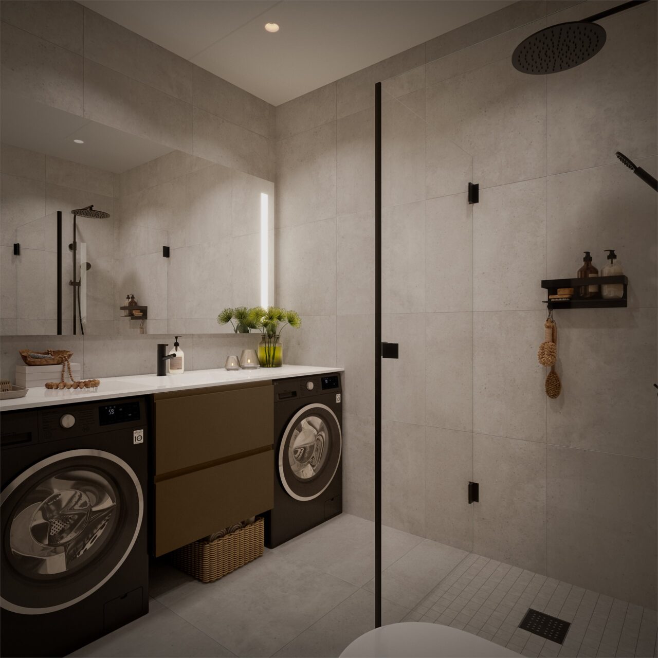 Bad blir levert som prefabrikkerte våtromsmoduler (badekabiner). Størrelse på innredning tilpasses de ulike baderomstypene. Det leveres i hovedsak rette dusjvegger i glass. Dusjarmatur leveres montert på vegg. Farge og størrelser på fliser kan avvike fra illustrasjoner, og vil ikke ha fugefølge mellom gulv og vegg. Baderomsinnredning leveres med skuffer og over servant monteres speil med belysning og stikkontakt. Stikkontakt kan være plassert ved siden av baderomsinnredning. Mindre ansamlinger av vann vil kunne forekomme på baderomsgulvet. Det er avsatt plass til vaskemaskin/ tørketrommel på ett av badene i hver leilighet. For leveranse på WC og bad, se romskjema.