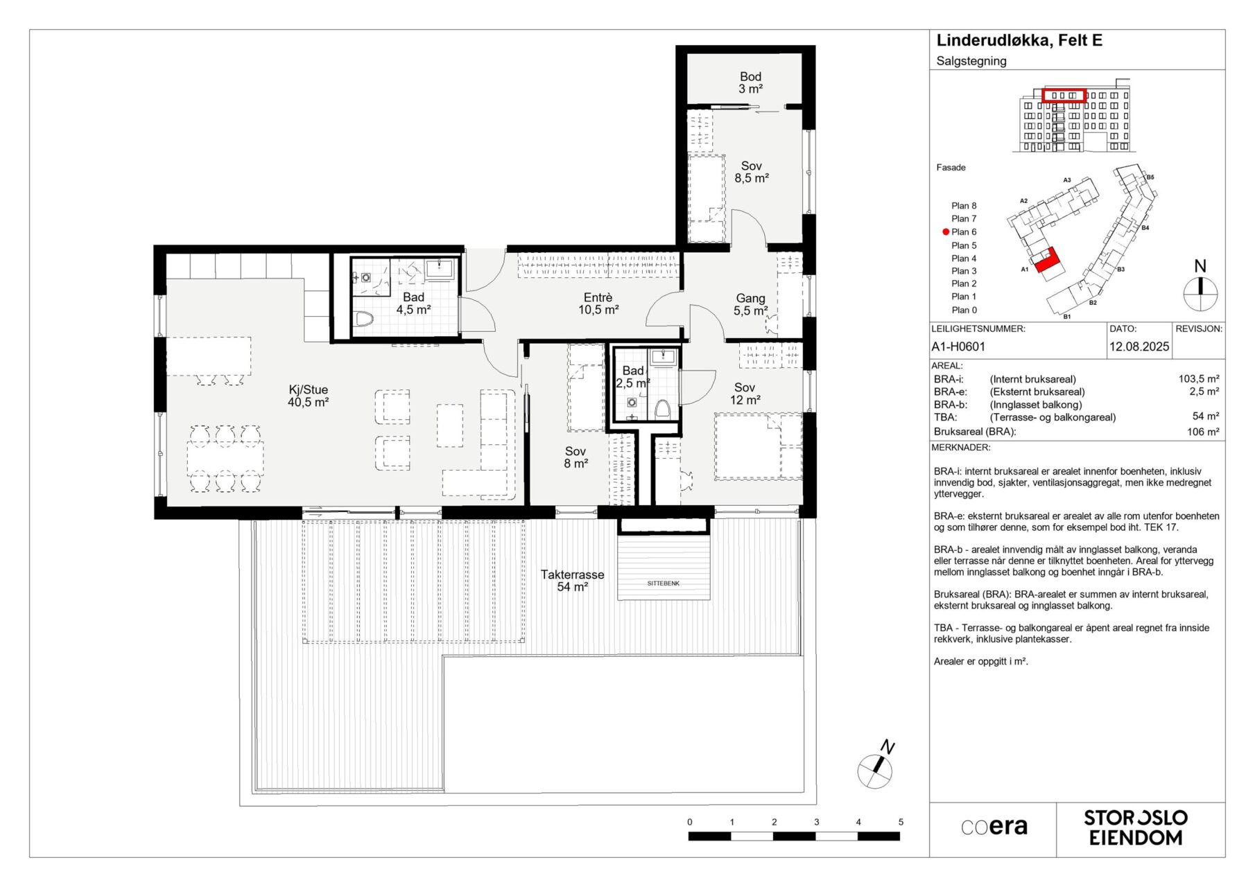 A1-H0601 er en flott 4-roms leilighet beliggende i 6. etasje. Leiligheten inneholder entré med plass for stor garderobeløsning, og adkomst til ett av leilighetens to bad. Videre er det tre soverom og en mellomgang som kan fungere som kontor. Hovedsoverommet er direkte tilknyttet eget bad, og vender mot indre gårdsom, samt egen takterrasse.