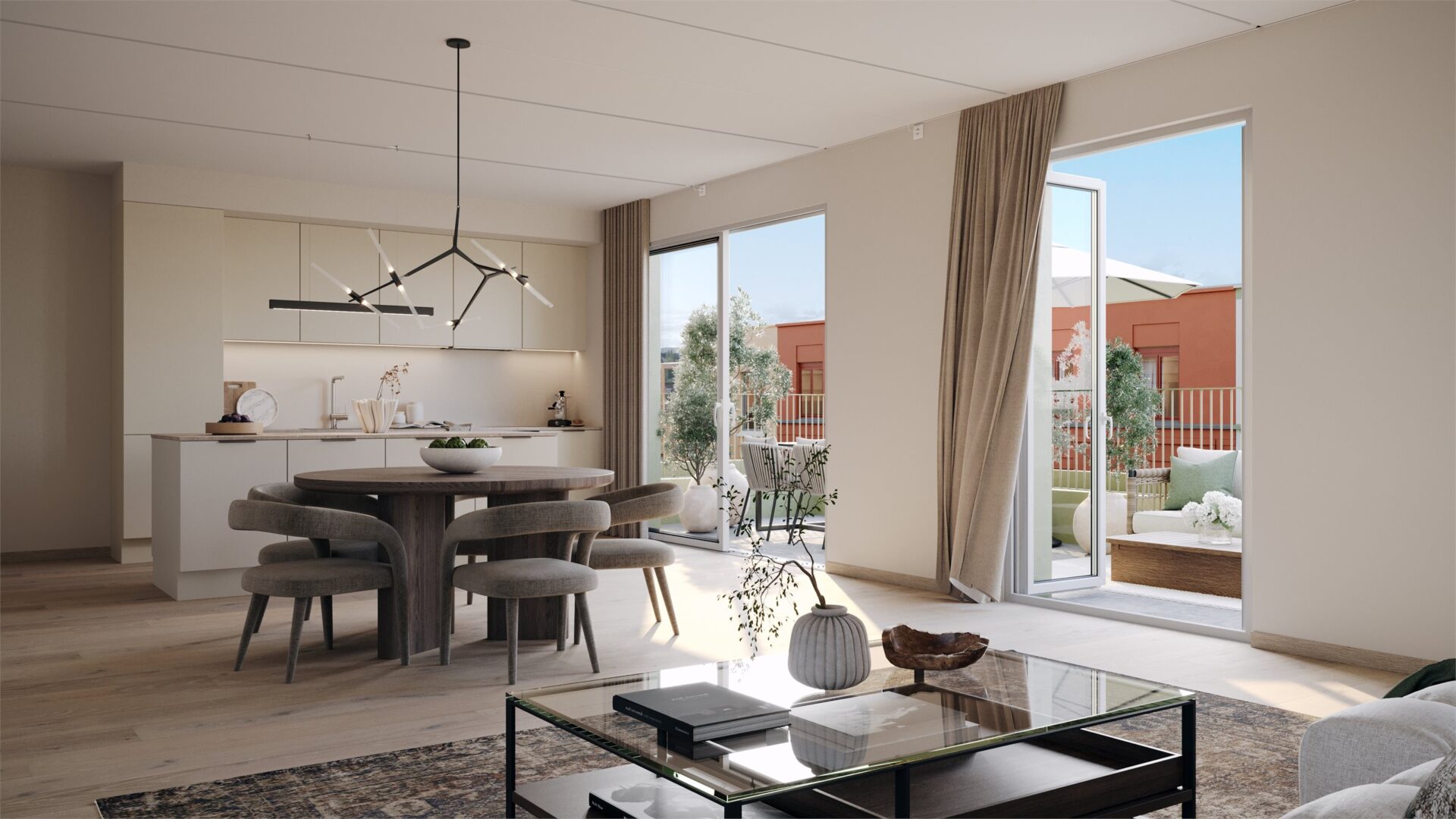 For at du skal kunne sette ditt personlige preg på boligen, tilbys det tre nøye sammensatte og kostnadsfrie interiørkonsepter for kjøkkenfronter og veggfarger. Alle gir boligen særpreg og en lun, moderne atmosfære – du velger det som passer din smak best. Konseptet Korn leveres som standard.