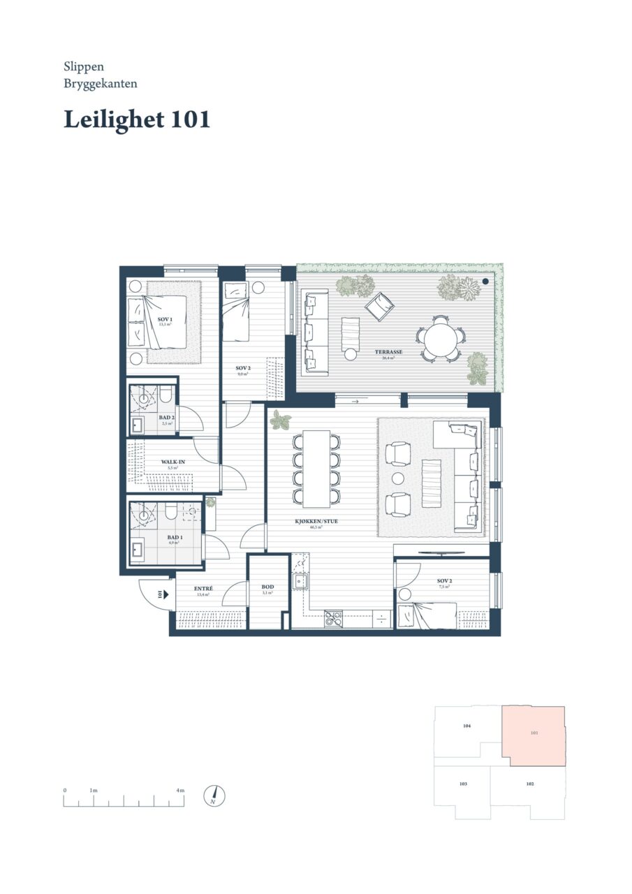 Leilighetene på Slippen har gjennomtenkte planløsninger og nesten alle vil se sjøen. Det leveres en gjennomgående god standard med bla. kjøkkeninnredning fra Drømmekjøkkenet, integrerte hvitevarer fra Siemens, balansert ventilasjon og lekre storformatfliser på baderommene.