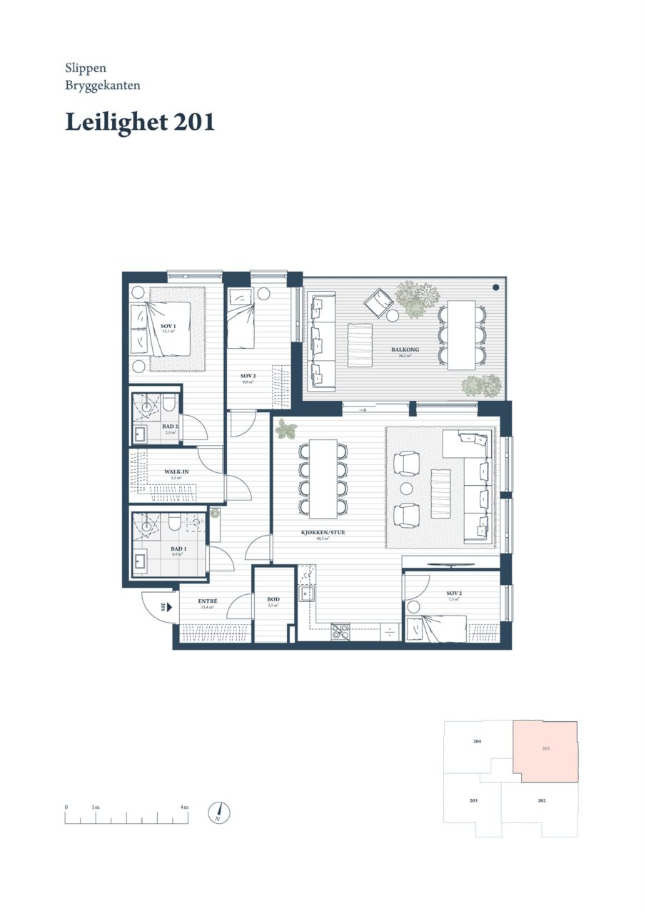 D201 er en flott 4-roms hjørneleilighet beliggende i 2. etasje. Leiligheten inneholder entré med plass for garderobeløsning og innvendig bod. Den har tre soverom og to bad, hvorav ett av badene er direkte tilknyttet hovedsoverommet som også har walk-in. Videre er det en åpen stue-/kjøkkenløsning med plass for både spisebord og sofagruppe. Fra stuen har man utgang til balkongen.
