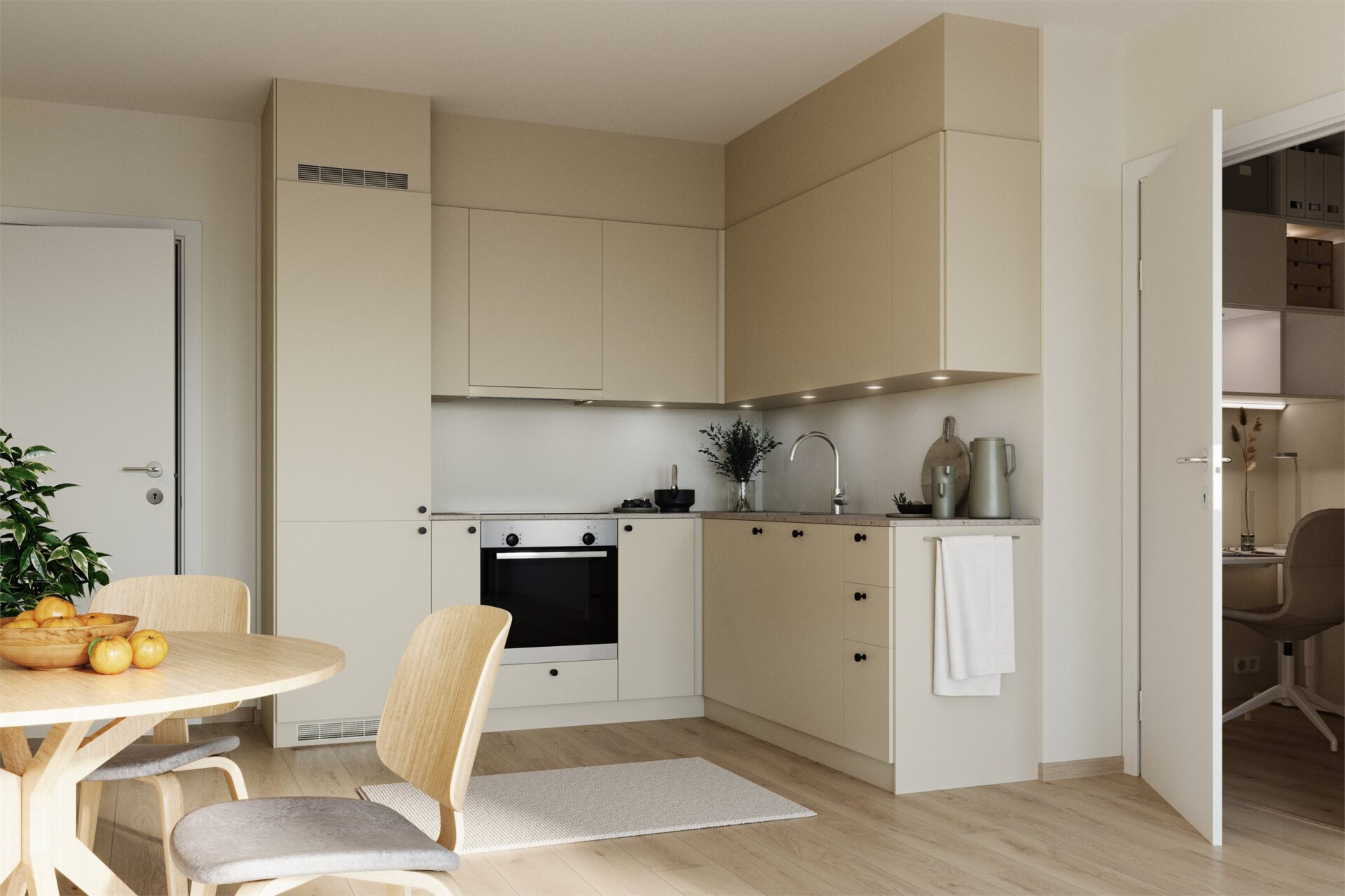 Leveres fra HTH. Fronter i lys beigetone, benkeplate laminat, hvitevarer integrert (Bosh eller tilsv.). Armatur fra Hansgrohe type Focus M41 EcoSmart i krom eller tilsvarende. Ventilator fra Røros Crystall med Monoblokkfilter med komfyrvakt levert av elektro. Ventilator leveres hvit. Det tas forbehold om bytte av leverandører og modeller, nye produkter skal i så fall skal ligge på samme kvalitet som her angitt.