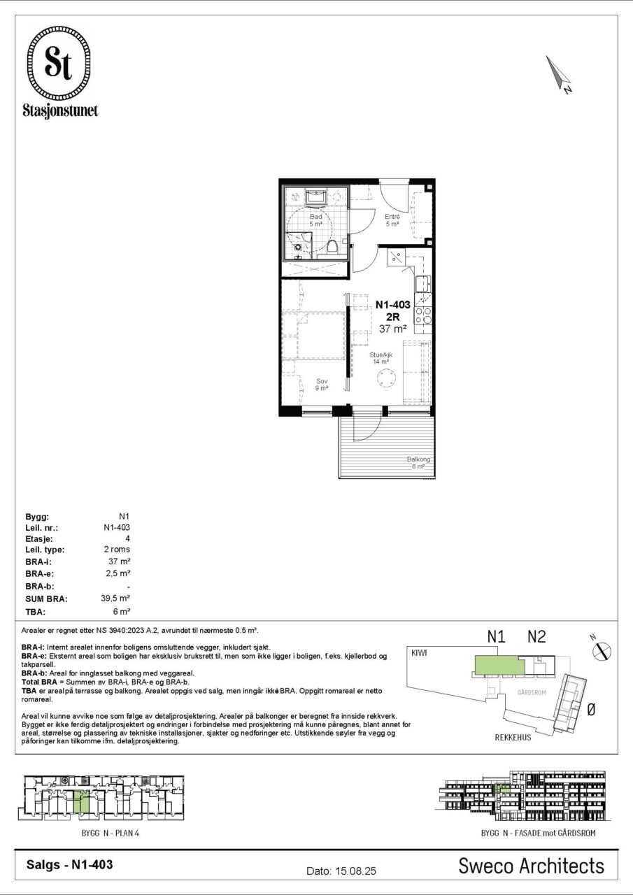 Arealet er beregnet ut fra Norsk standard NS 3940:2023. BRA-i: Internt arealet innenfor boligens omsluttende vegger, inkludert sjakt. BRA-e: Eksternt areal som boligen har eksklusiv bruksrett til, men som ikke ligger i boligen, f.eks. kjellerbod. BRA-b: Areal for innglasset balkong med veggareal. Total BRA = Summen av BRA-i, BRA-e og BRA-b. TBA er areal på terrasse og balkong. Arealet oppgis ved salg, men inngår ikke i BRA. Oppgitt romareal er netto romareal. De oppgitte arealer er å betrakte som cirka-arealer. Partene har ingen krav mot hverandre dersom arealet skulle vise seg å være 5 % mindre / større enn det oppgitte areal.