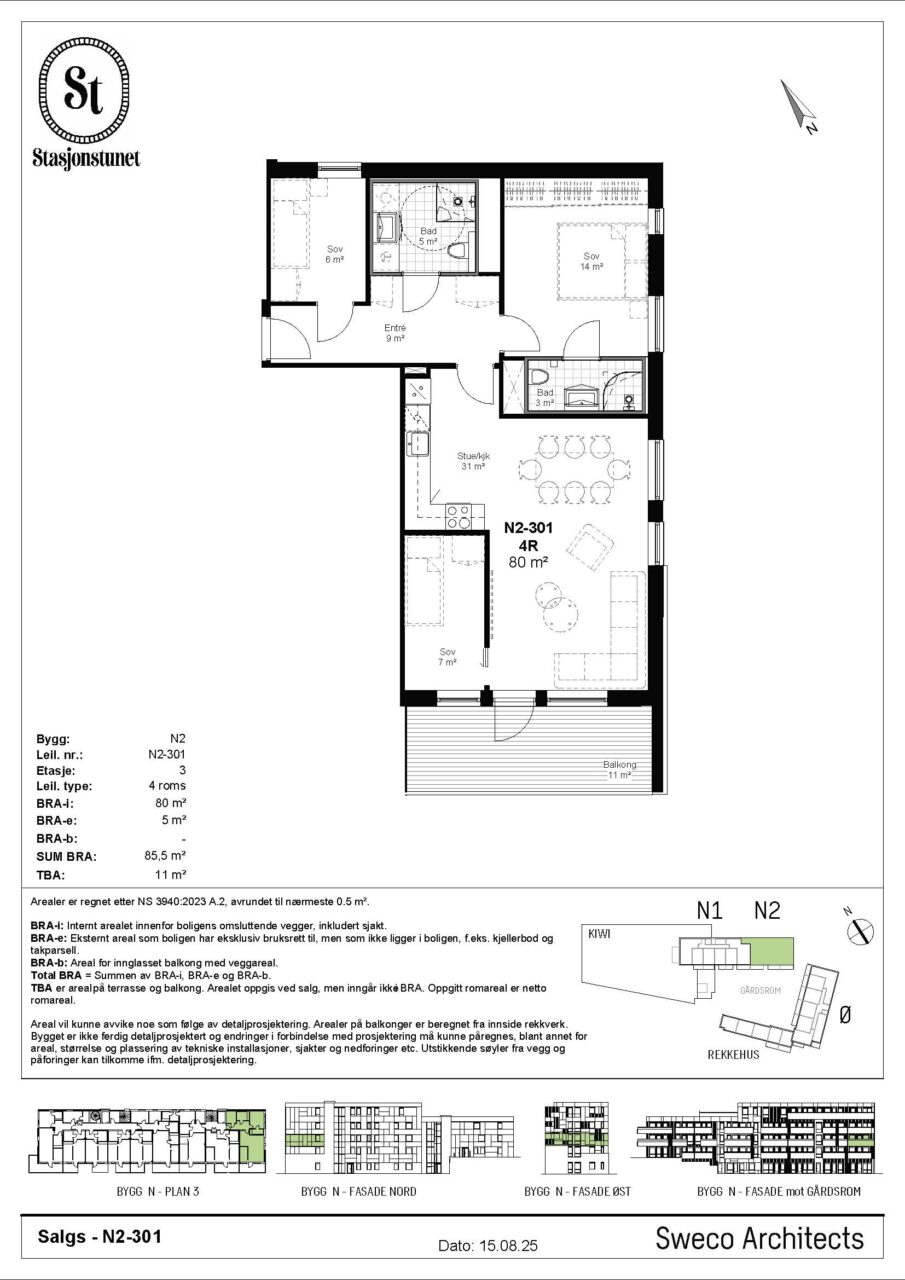 Arealet er beregnet ut fra Norsk standard NS 3940:2023. BRA-i: Internt arealet innenfor boligens omsluttende vegger, inkludert sjakt. BRA-e: Eksternt areal som boligen har eksklusiv bruksrett til, men som ikke ligger i boligen, f.eks. kjellerbod. BRA-b: Areal for innglasset balkong med veggareal. Total BRA = Summen av BRA-i, BRA-e og BRA-b. TBA er areal på terrasse og balkong. Arealet oppgis ved salg, men inngår ikke i BRA. Oppgitt romareal er netto romareal. De oppgitte arealer er å betrakte som cirka-arealer. Partene har ingen krav mot hverandre dersom arealet skulle vise seg å være 5 % mindre / større enn det oppgitte areal.