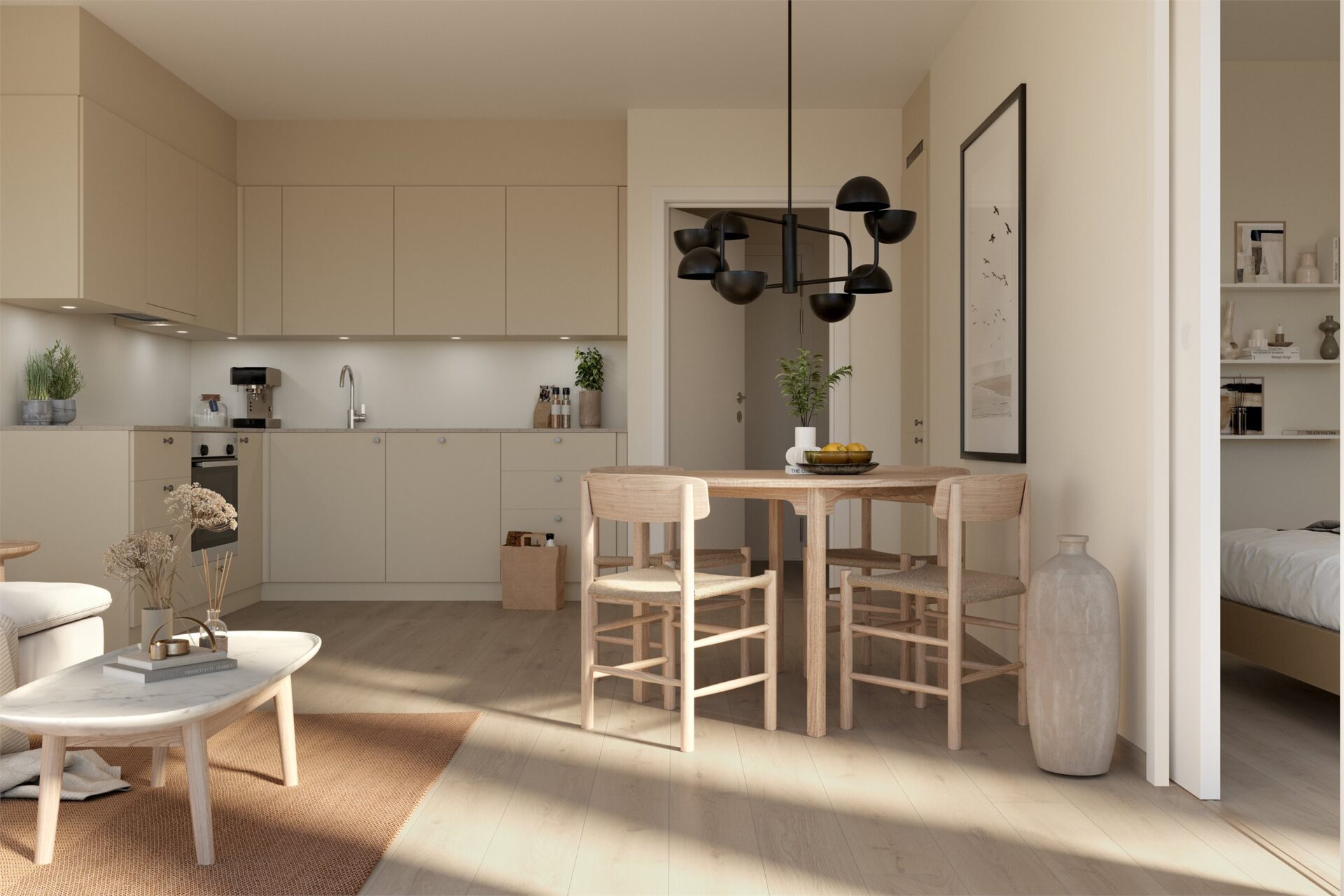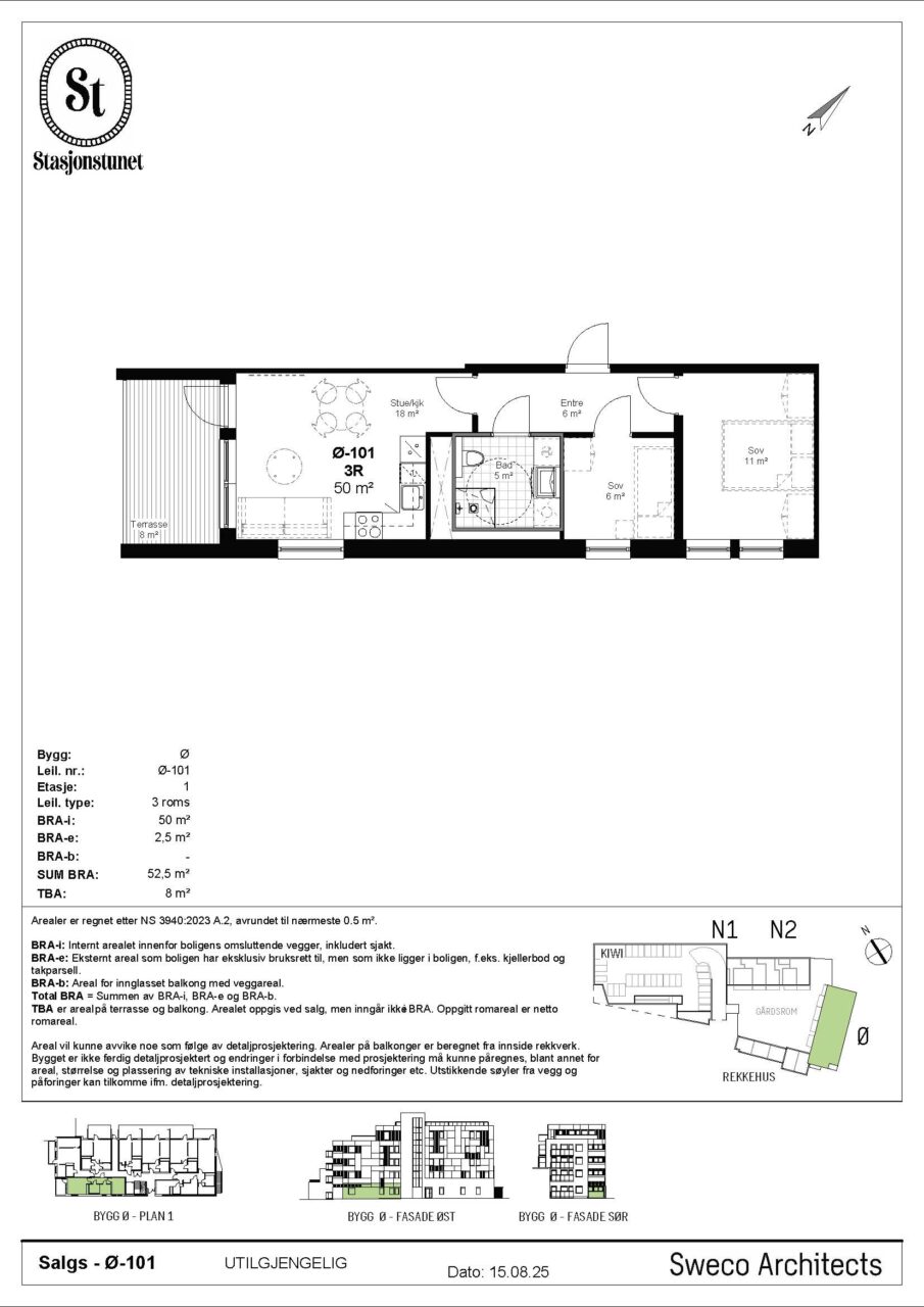 Stasjonstunet består av 68 moderne leiligheter og 5 rekkehus – et nytt nabolag som kombinerer bokvalitet, smarte løsninger og et variert boligtilbud. Leilighetene og rekkehusene i Stasjonstunet er utformet med fokus på bokvalitet, lys og funksjonelle planløsninger. De rene linjene og den harmoniske fargepaletten skaper et tidløst uttrykk, mens store vindusflater og private uteplasser gir en luftig og behagelig romfølelse. Materialene er valgt med omtanke – fra den lyse eikeparketten til de elegante flisene på badet – og de små detaljene vitner om solid håndverk og høy standard. Her får du moderne komfort med heis, fjernvarme og balansert ventilasjon, kombinert med energieffektive løsninger og bærekraftige valg. Nedgravde avfallssystemer og garasjeanlegg med elbil-infrastruktur gjør hverdagen enkel og ryddig.