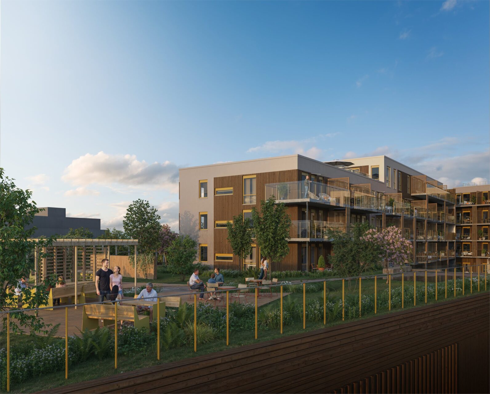 Boligbebyggelsen består av blokkbebyggelse med fem etasjer og rekkehus i tre etasjer, oppført på felles kjelleretasje med parkering, boder og tekniske rom. Byggene er tegnet av Sweco Architects og kjennetegnes av varierte volumer og moderne fasader med robuste materialer. Alle boliger har private uteplasser i form av balkong, markterrasse eller takterrasse. Det etableres heis til alle leilighetsplan.