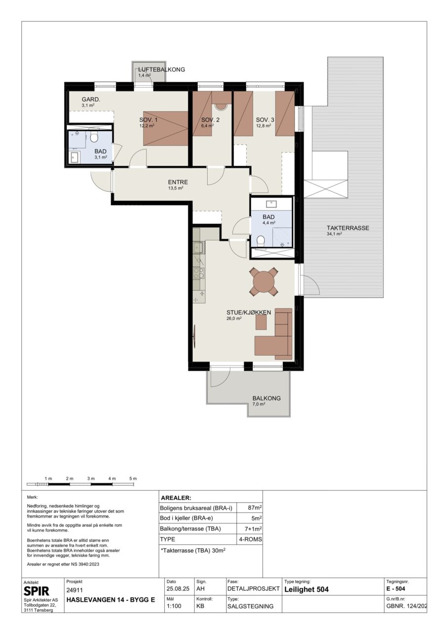 Leiligheten inneholder entré med plass til garderobeløsning og med adkomst til ett av boligens to bad, samt tre soverom. Hovedsoverom er på romslige 12,2 kvm, med tilgang til eget bad, walk-in closet og luftebalkong. Videre fra gangen kommer man inn i en stor og åpen stue- og kjøkkenløsning med vinkelkjøkken og gode møbleringsmuligheter. Fra stuen har man adkomst til syd-vestvendt balkong på 7 kvm og en egen privat takterrasse på 34 kvm.
