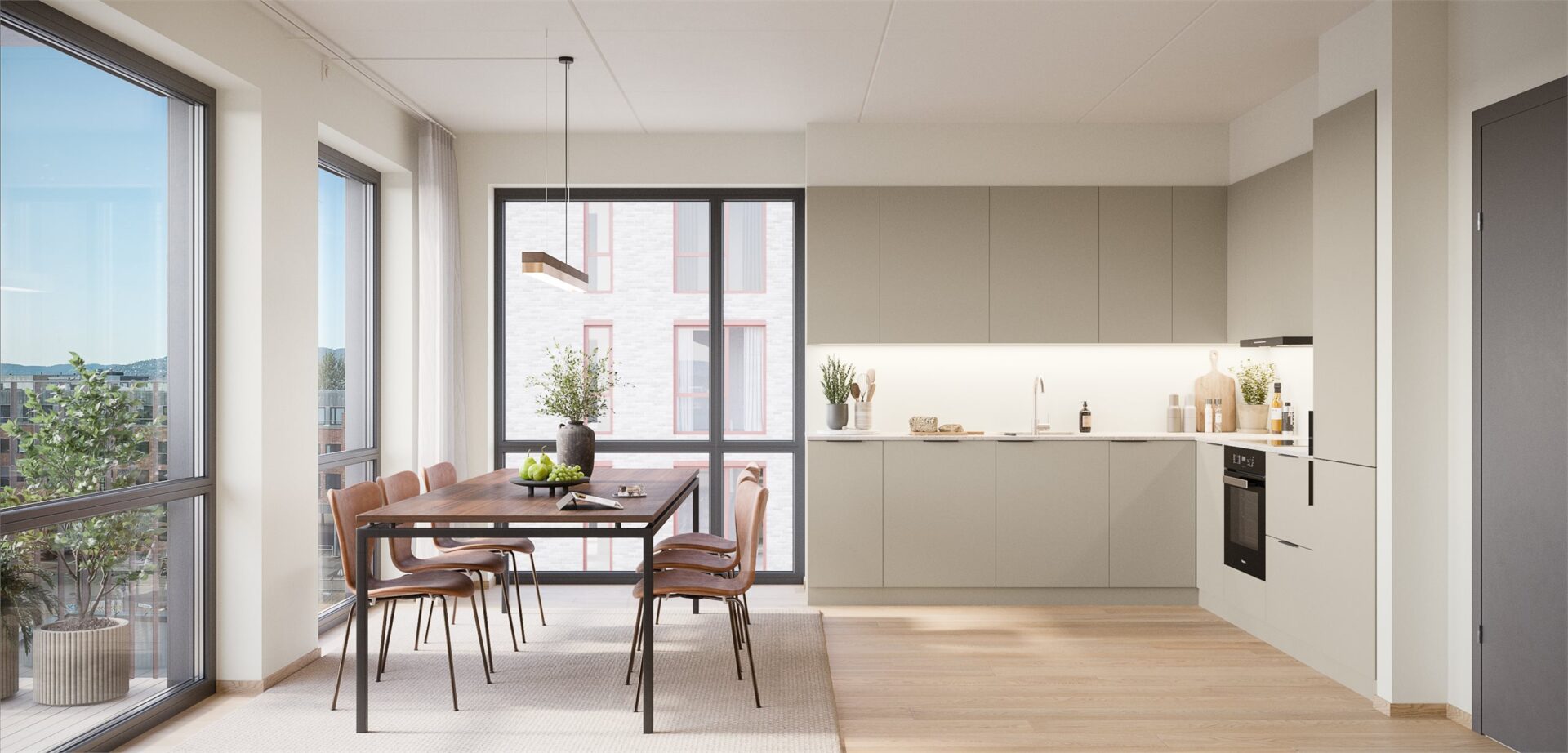 Det leveres kjøkkeninnredning fra HTH modell ES Base. Spesifisert tegning og beskrivelse av kjøkken vil bli utarbeidet for hver enkelt leilighet i forbindelse med tilvalgsprosessen. Det gjøres oppmerksom på at volumet ovenfor overskap vil måtte bli benyttet til fremføring av ventilasjonskanaler og derfor ikke kan benyttes som skapplass. Det leveres ikke hvitevarer, men hvitevarepakker kan bestilles som tilvalg. Plassering av teknisk utstyr i kjøkkenet er ikke endelig besluttet, og kan avvike fra hva som vises på salgstegninger.