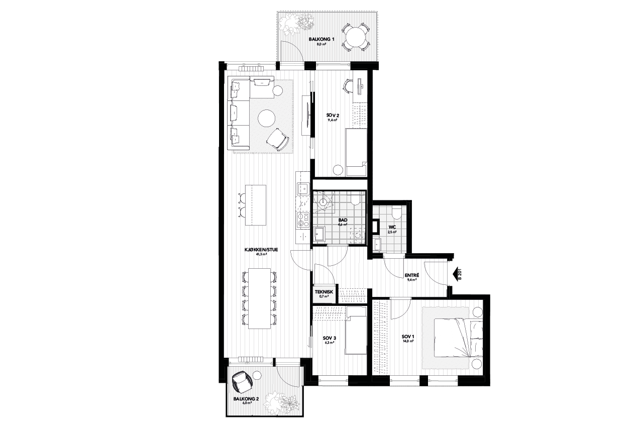 Terrassebord på markterrasser, balkonger og takterrasser. Rekkverk på balkongervendt mot Hans Møller Gasmanns vei leveres med