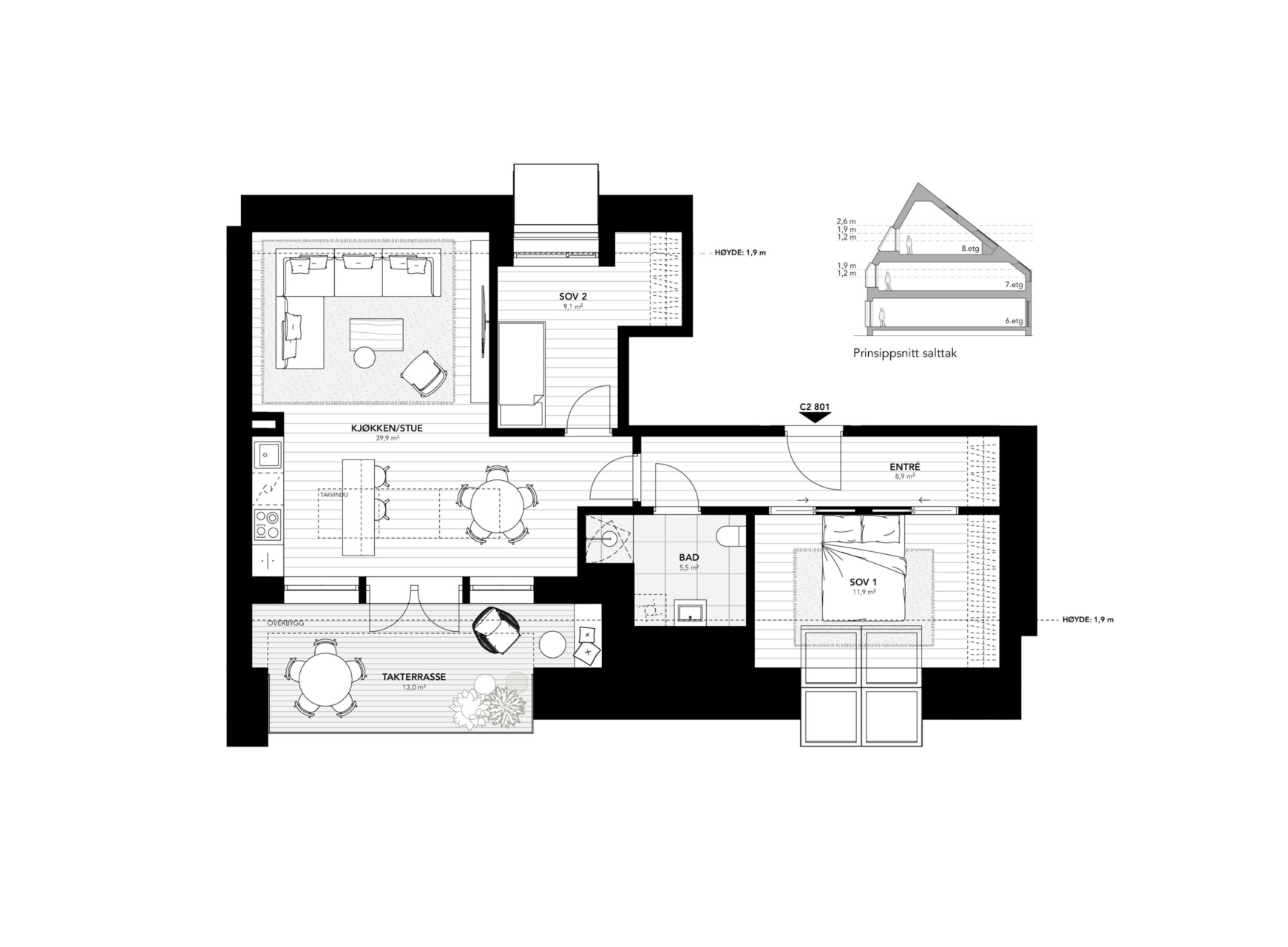 Attraktiv 3-roms toppleilighet med vinduer og lysinnslipp fra tre sider, med utgang til sydvendt privat takterrasse. Entré med plass til garderobe. Stor åpen stue- og kjøkkenløsning med gode møbleringsmuligheter, plass til sofahjørnet og spisestue. Leiligheten får to soverom, hovedsoverommet får takvindu og god plass til dobbeltseng og garderobe. Delikat bad med wc, servant og dusjhjørnet.