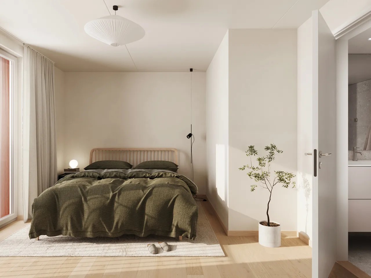 Duse og naturlige toner i beige legger til rette for en avslappende og lun atmosfære og lar detaljer tre frem. I standard interiørkonsept får du kjøkken i en delikat beige farge sammen med laminat benkeplate i naturstein imitasjon. Kjøkkenet får integrerte hvitevarer fra Siemens og benkeventilator fra Bora. Armatur og øvrige detaljer i krom utførelse. Enstavs hvitpigmentert eikeparkett i en matt utførelse sammen med lyse gråbeige vegger skaper et dempet og rolig uttrykk i leiligheten.