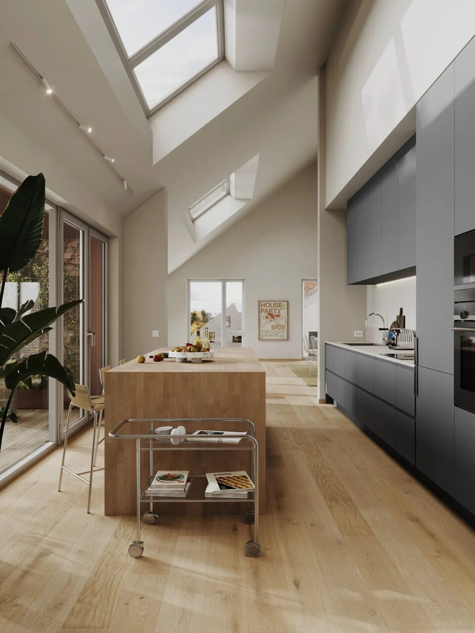 Interiørdesignet er tidløst og nøytralt, noe som gir plass til folks egne personligheter og liv. Det skal oppleves like aktuelt om 15 år som i dag. Å tenke bærekraft har vært førende. Det har vært jobbet mye med planløsningene for å få maksimalt ut av tilgjengelig plass og bygge på de naturlige forutsetningene i omgivelsene