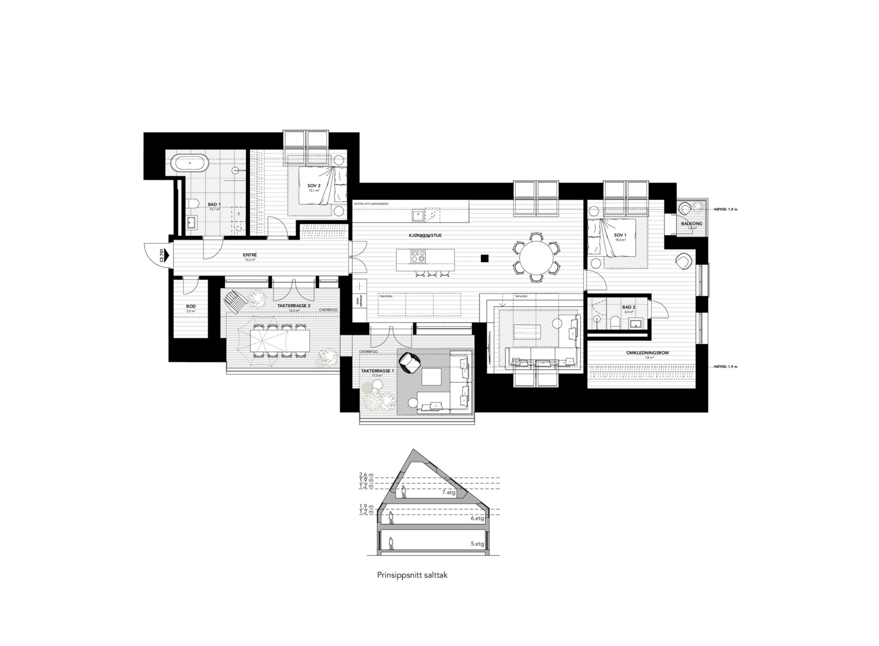 Stor og lys 3-roms toppleilighet med vinduer og lysinnslipp fra tre sider, med utgang til to romslige sydvendte takterrasser. Entré med avsatt plass til garderobe. Stor åpen stue- og kjøkkenløsning med gode møbleringsmuligheter, plass til sofahjørnet og spisestue. To delikate bad med wc, servant og dusjhjørnet. Leiligheten får to soverom, hovedsoverom får eget omkledningsrom og direkte adkomst til et av badene.