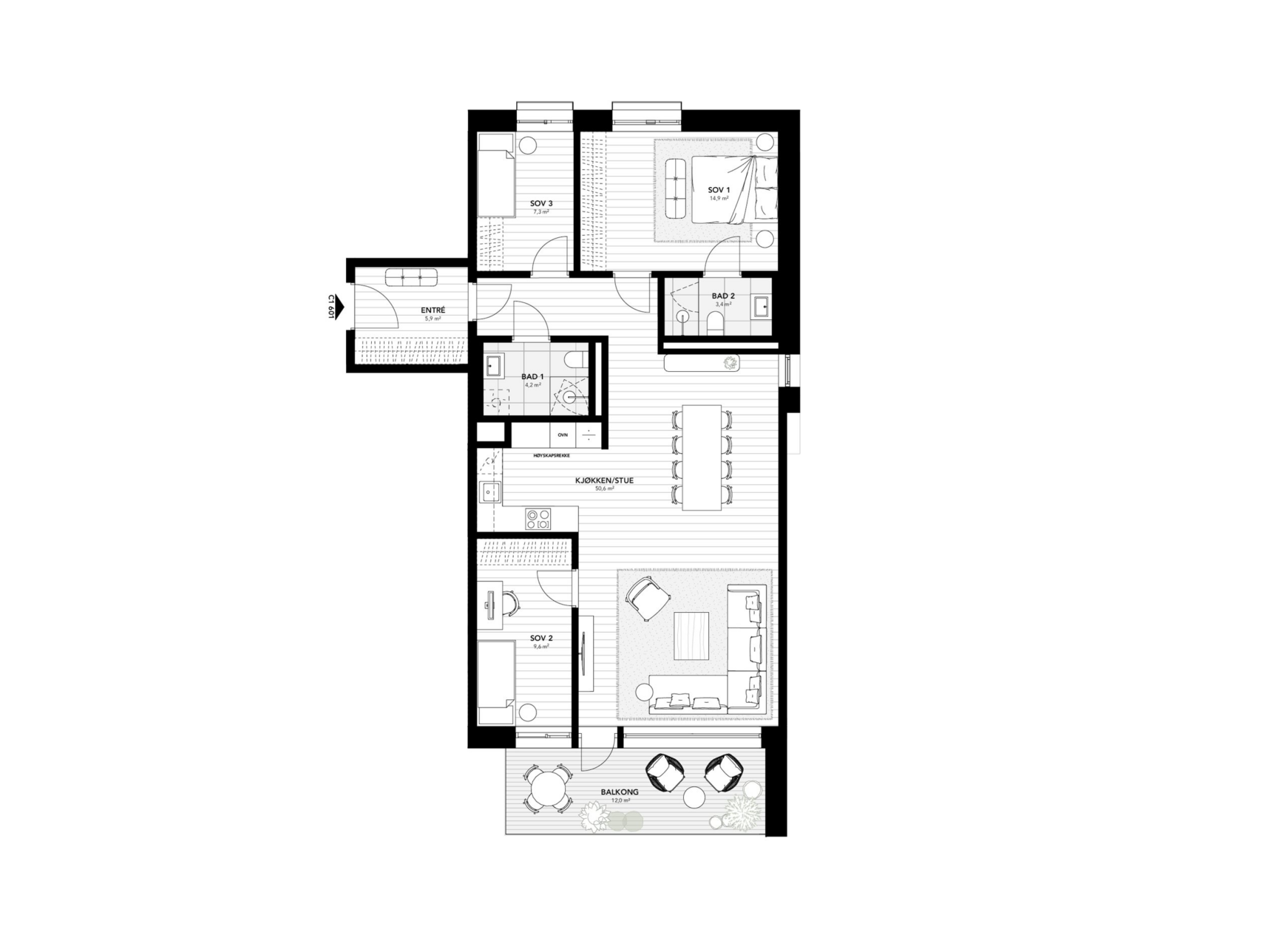 Stor gjennomgående 4-romsleilighet med romslig sydvendt balkong. Leiligheten får entré med avsatt plass til garderobe. Romslig og luftig stue med god plass til sofahjørne og TV, samt spisestue i kombinasjon med åpen kjøkkenløsning. Leiligheten har tre soverom, med god plass til dobbeltseng på hovedsoverommet. Plass til garderobe på alle soverom. Leiligheten har to delikate bad, med dusjhjørne, toalett og servant, samt opplegg for vaskemaskin på det største badet. Hovedsoverom med direkte tilgang til eget bad.