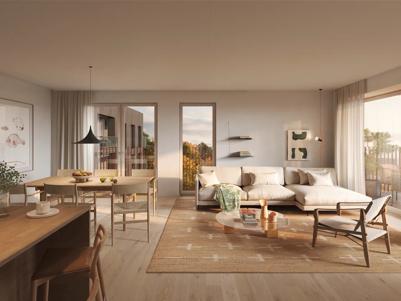 Duse og naturlige toner i beige legger til rette for en avslappende og lun atmosfære og lar detaljer tre frem. I standard interiørkonsept får du kjøkken i en delikat beige farge sammen med laminat benkeplate i naturstein imitasjon. Kjøkkenet får integrerte hvitevarer fra Siemens og benkeventilator fra Bora. Armatur og øvrige detaljer i krom utførelse. Enstavs hvitpigmentert eikeparkett i en matt utførelse sammen med lyse gråbeige vegger skaper et dempet og rolig uttrykk i leiligheten.