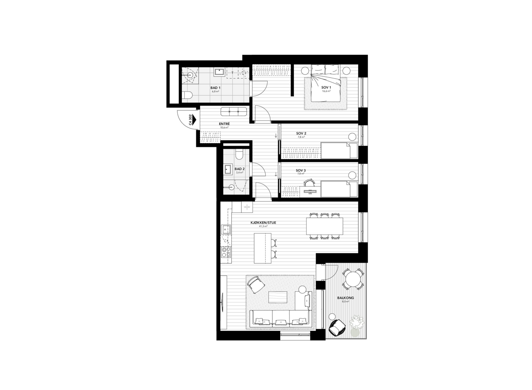 Stor 4-roms hjørneleilighet med flott balkong. Entré med avsatt plass for garderobe. Åpen og lys stue med plass til sofahjørne og TV, samt spisestue i kombinasjon med åpen kjøkkenløsning. Leiligheten har tre soverom. Hovedsoverommet har plass til dobbeltseng, garderobe og direkte adkomst til bad med dusjhørne, toalett, servant og opplegg for vaskemaskin, samt avsatt plass til tørketrommel. Leiligheten har også et mindre bad, med dusj, toalett og servant.