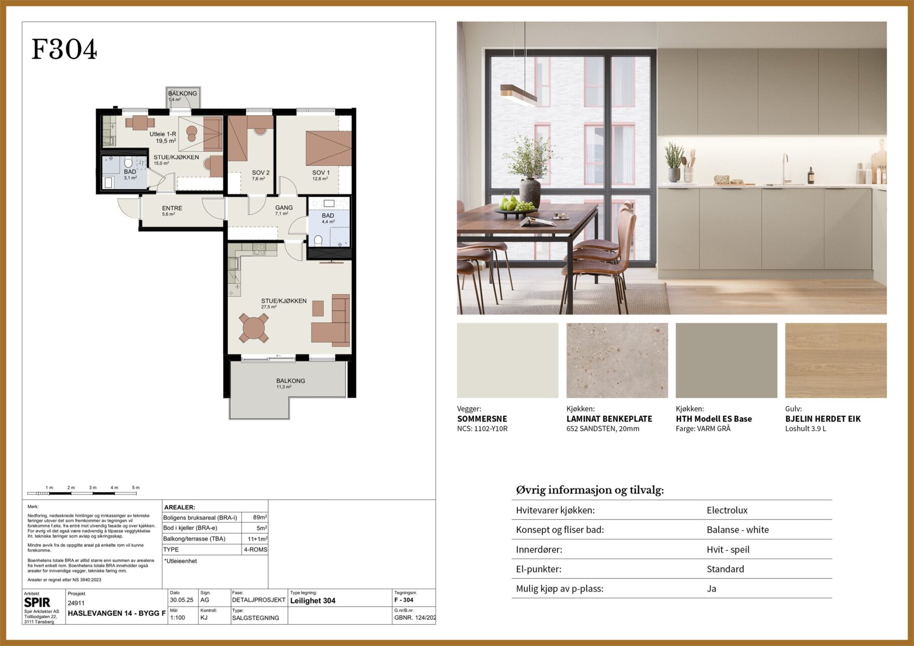 Eventuelle tilleggsbestillinger/endringer betales etter nærmere avtale med selger. Resterende del av kjøpesummen betales innen kl. 16.00, 3 dager før overtakelse. Alle innbetalinger skal betales inn fra kjøpers konto i norsk finansinstitusjon.