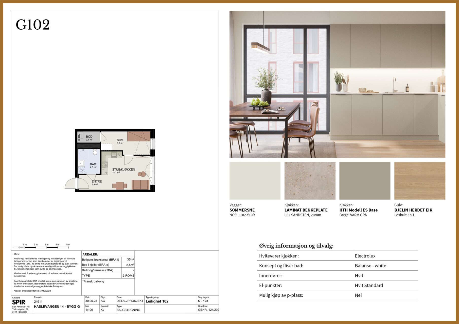 Leilighet G102 er en arealsmart 2-roms leilighet beliggende i 1. etasje. Leiligheten har en fin planløsning og inneholder et flislagt bad, soverom og en innvendig bod/teknisk rom. Videre er det en åpen stue- kjøkkenløsning med fransk balkong. Kjøkkenet blir levert fra HTH med integrerte hvitevarer fra Electrolux.