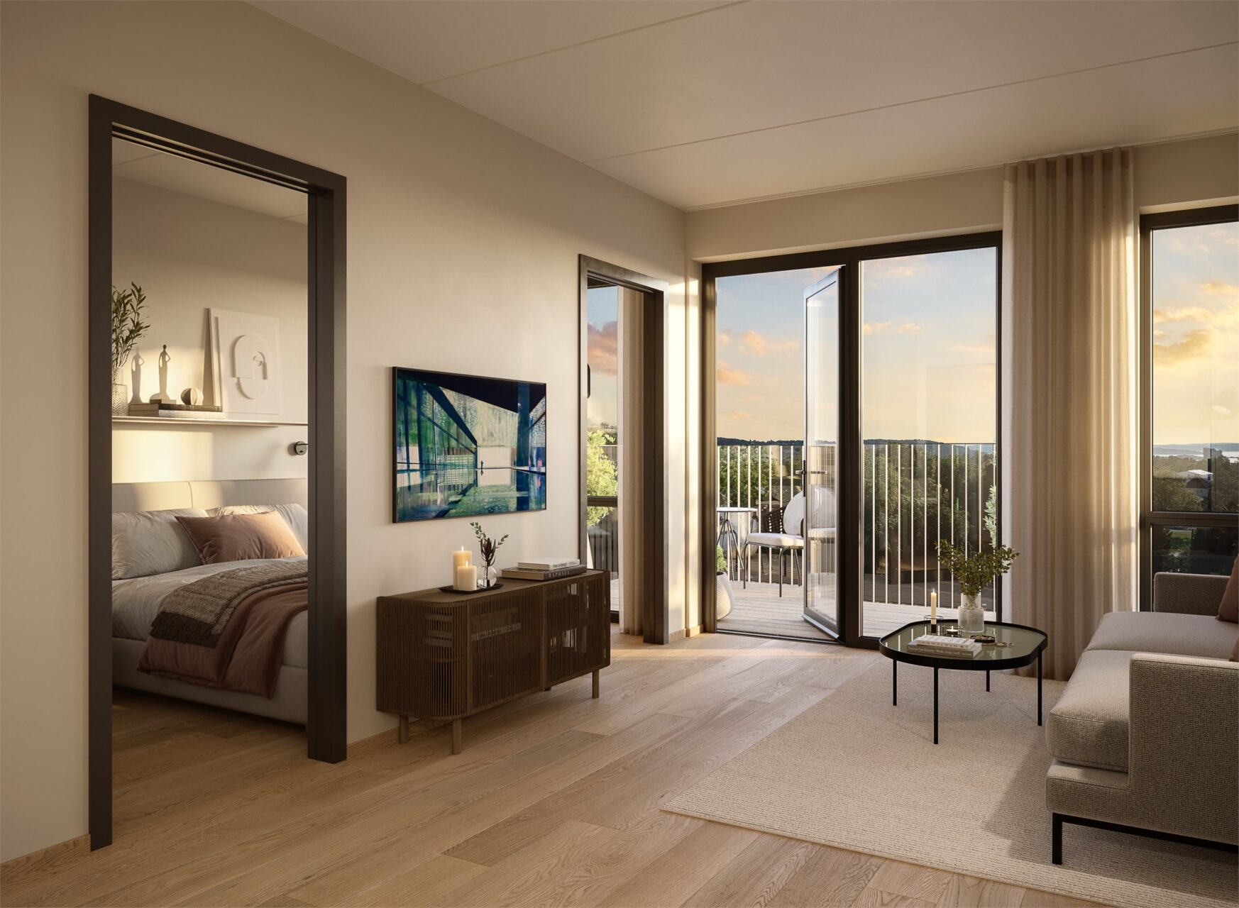 Vegger i leiligheten blir malt i fargen Sommersne, og det leveres Bjelin herdet eikeparkett på gulv.