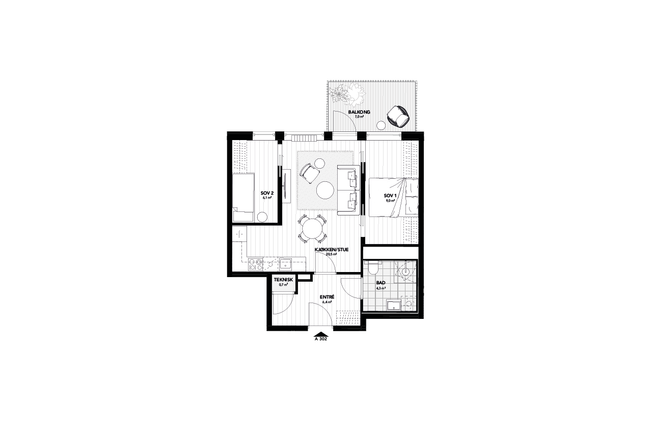 Terrassebord på markterrasser, balkonger og takterrasser. Rekkverk på balkongervendt mot Hans Møller Gasmanns vei leveres med
