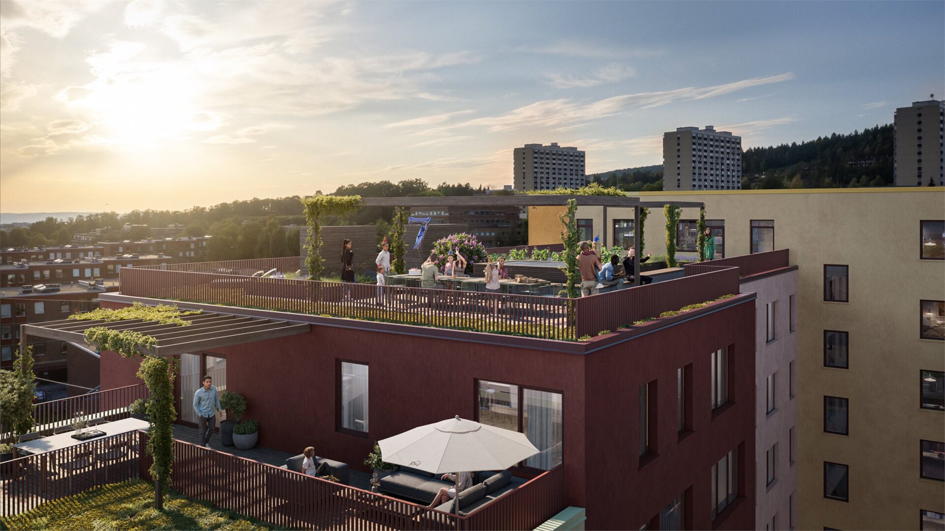 Her skapes et nytt nabolag, med moderne, urbane boliger omgitt av flotte uteområder i form av både gardsrom og felles takterrasser, som gjør hverdagen enkel og behagelig, både inne og ute. Du får et bredt servicetilbud, et trivelig torg, sosiale møteplasser, ny barnehage, flere kollektivforbindelser og bare 15 minutter med t-banen til Oslo S. I tillegg har du marka rett i nærheten.