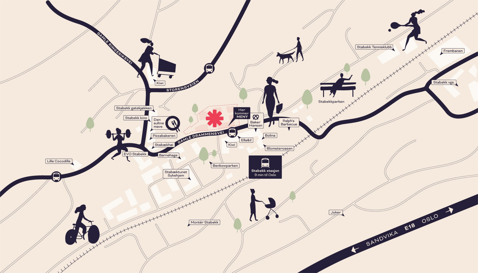 I Fryd blir du en del av et aktivt og frodig nærmiljø. Prosjektet inkluderer en vakker park og et helt nytt torg som sammen skaper et naturlig samlingspunkt for både beboere og innbyggere. Her kan du slappe av av i flotte omgivelser, møte naboer og venner, eller utforske de unike småbutikkene som tilfører den sjarmen og karakteren Stabekk er kjent for.