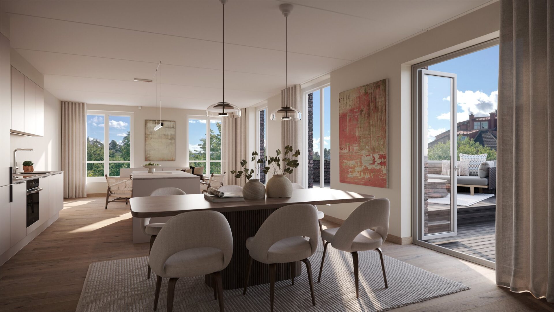 Sammen med Gitte Rimstad i RCO Interiørdesign er det satt sammen en helhetlig interiørstil. Innredningen i Fryd defineres av en tidløs estetikk med inspirasjon fra naturen og det nordiske lyset. Konseptet bygger på en lett og luftig base med fokus på enkelhet og visuell ro. De naturlige materialene og det minimalistisk formspråk er med på å skape et hjem med en innbydende atmosfære. Gulvet i 1-stavs eikeparkett binder rommene sammen og tilfører en naturlig varme som harmonerer vakkert med de nøytrale veggene.