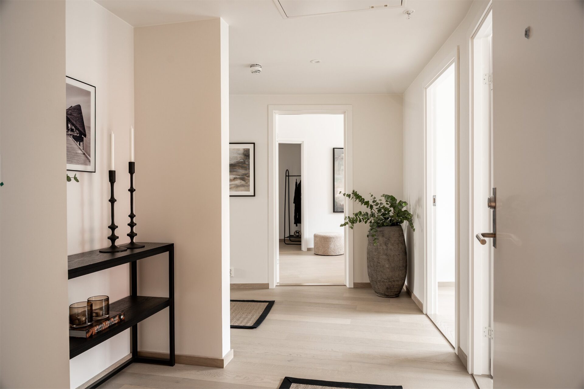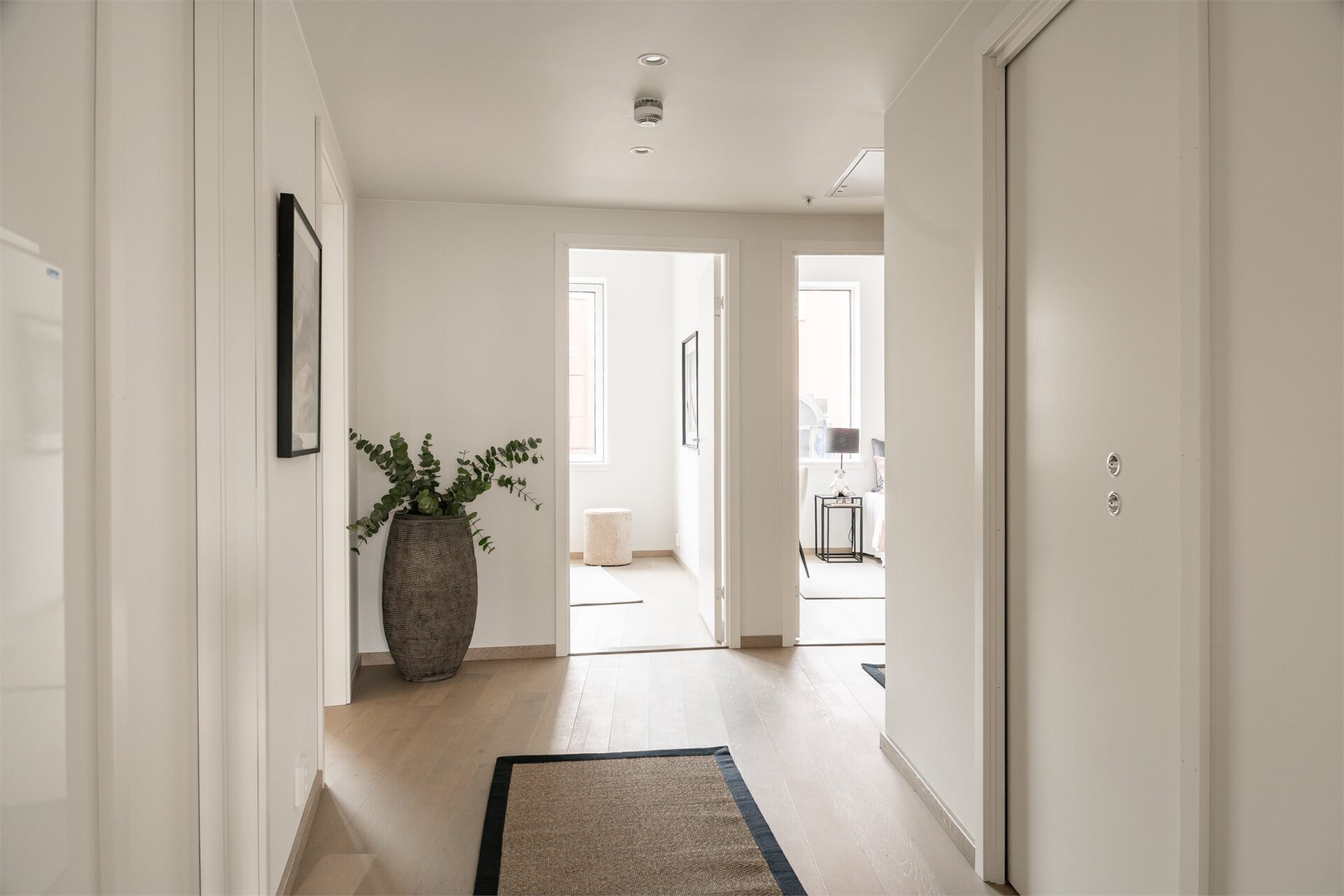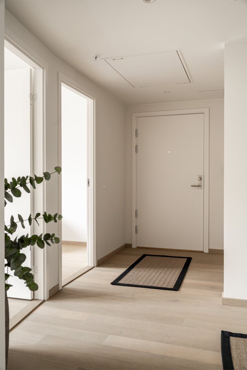 Entréen er på ca. 10,5 m² og har plass til garderobeløsning for yttertøy og sko. Fra entré tar man seg inn til stuen. Leiligheten vil bli levert med 1-stavs hvitpigmentert eikeparkett, noe som er gjennomgående for hele leiligheten.