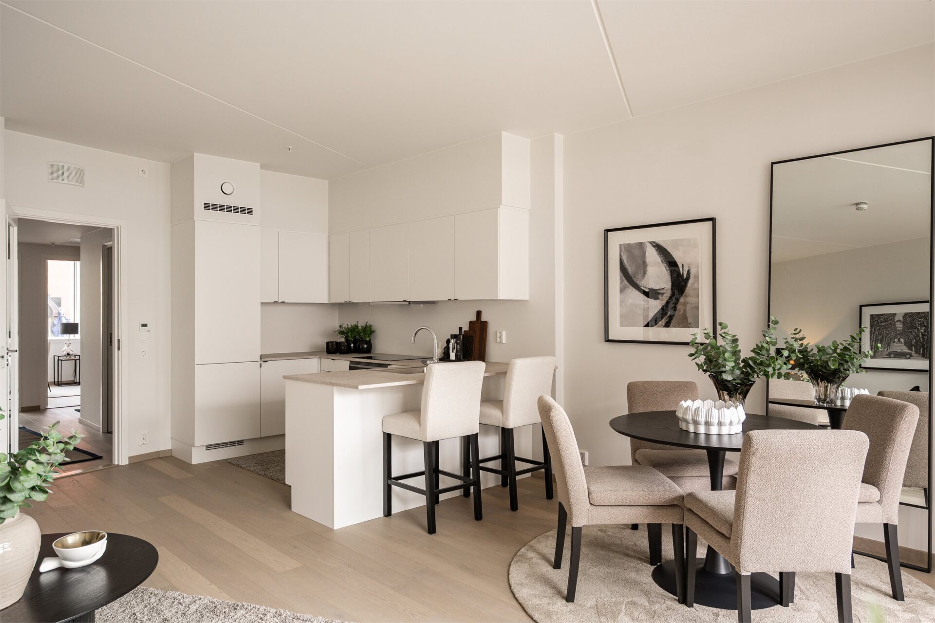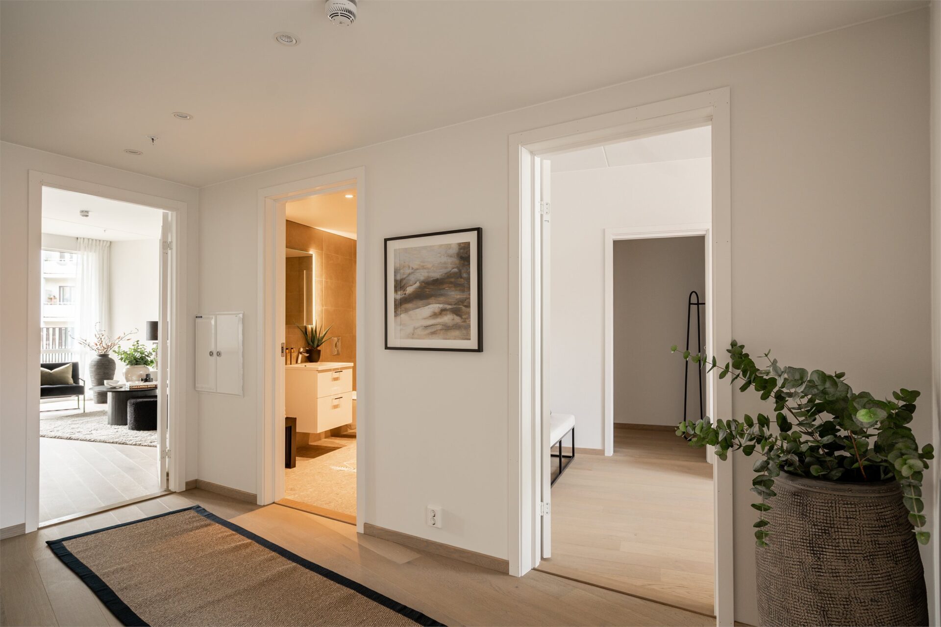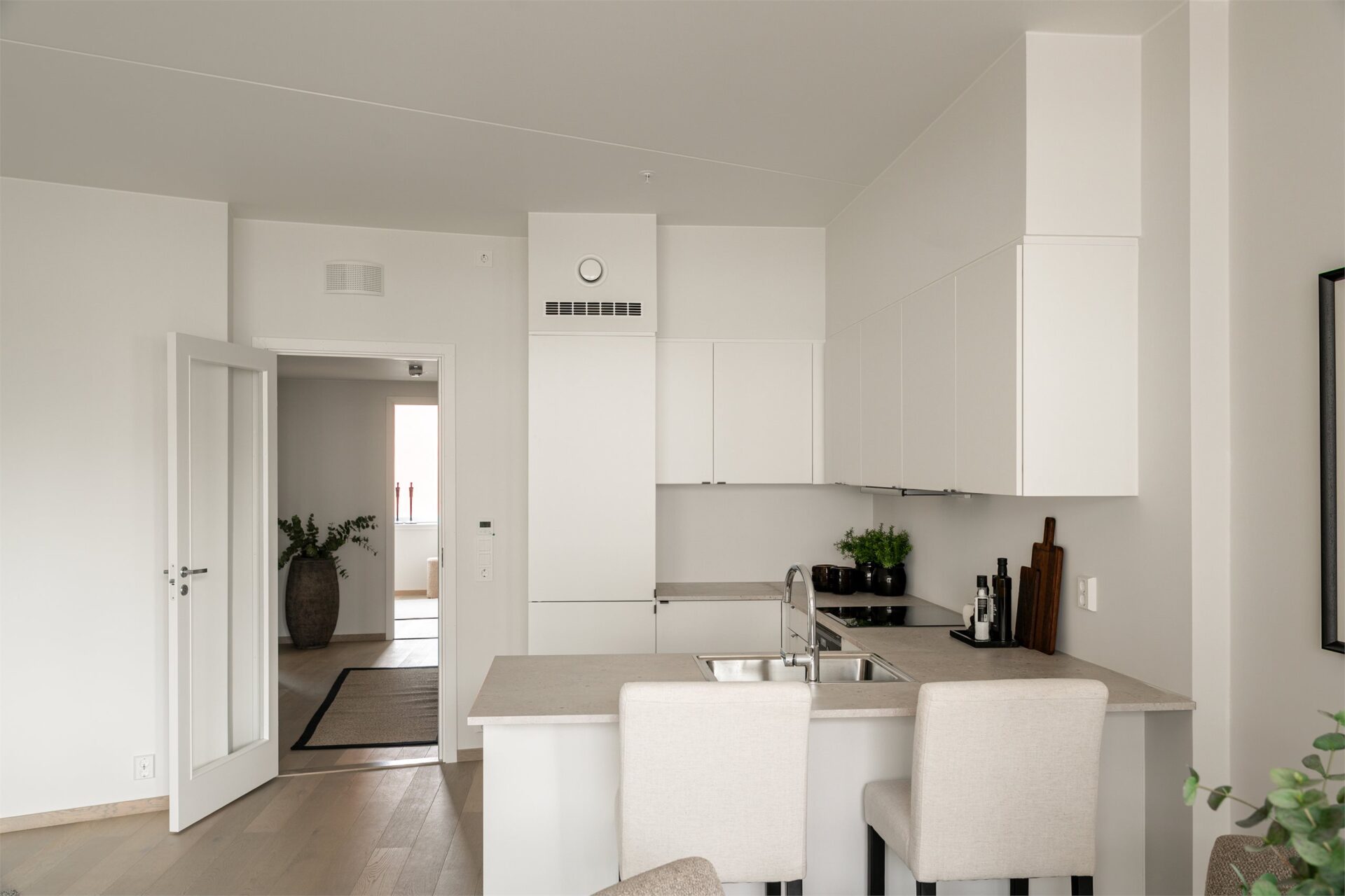 Entréen er på ca. 10,5 m² og har plass til garderobeløsning for yttertøy og sko. Fra entré tar man seg inn til stuen. Leiligheten vil bli levert med 1-stavs hvitpigmentert eikeparkett, noe som er gjennomgående for hele leiligheten.