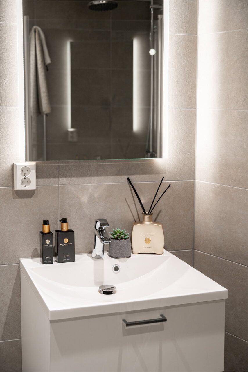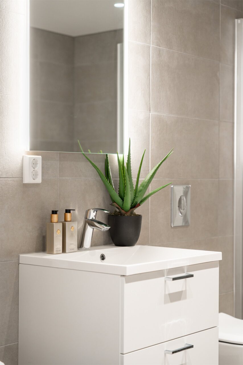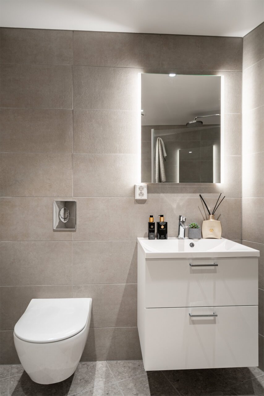 Leiligheten har to, pent flislagte baderom på hhv. 7 m² og 4,5 m². Badene inneholder WC, dusj med svingbare dører og servant. Hovedbaderom har opplegg for vaskemaskin.