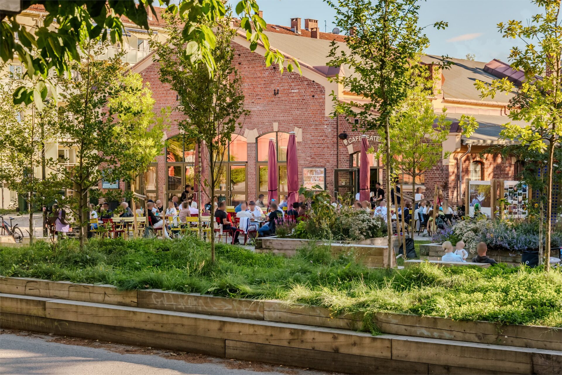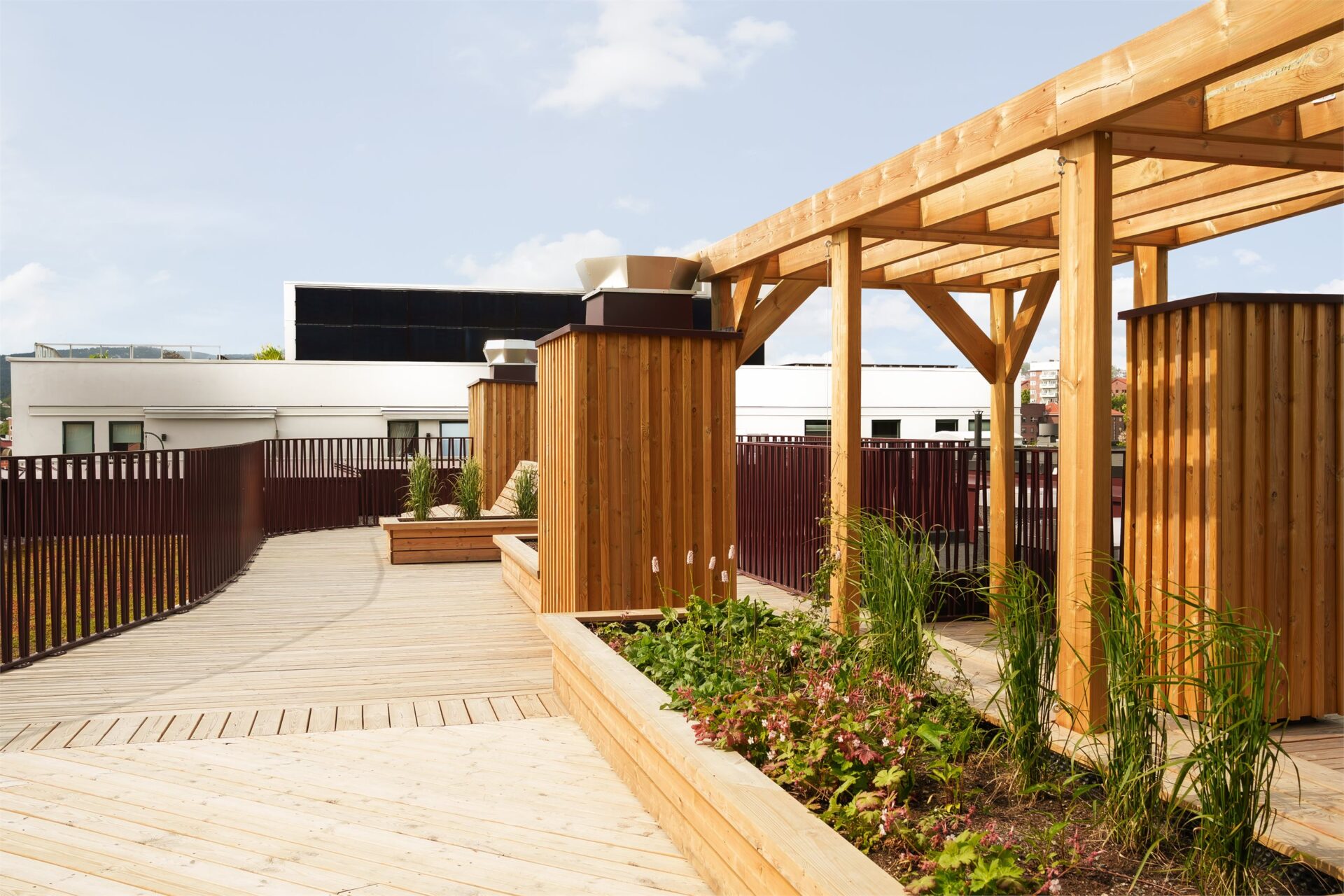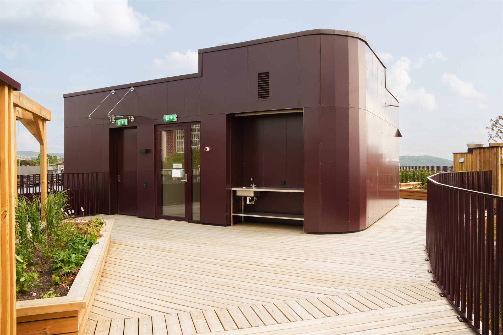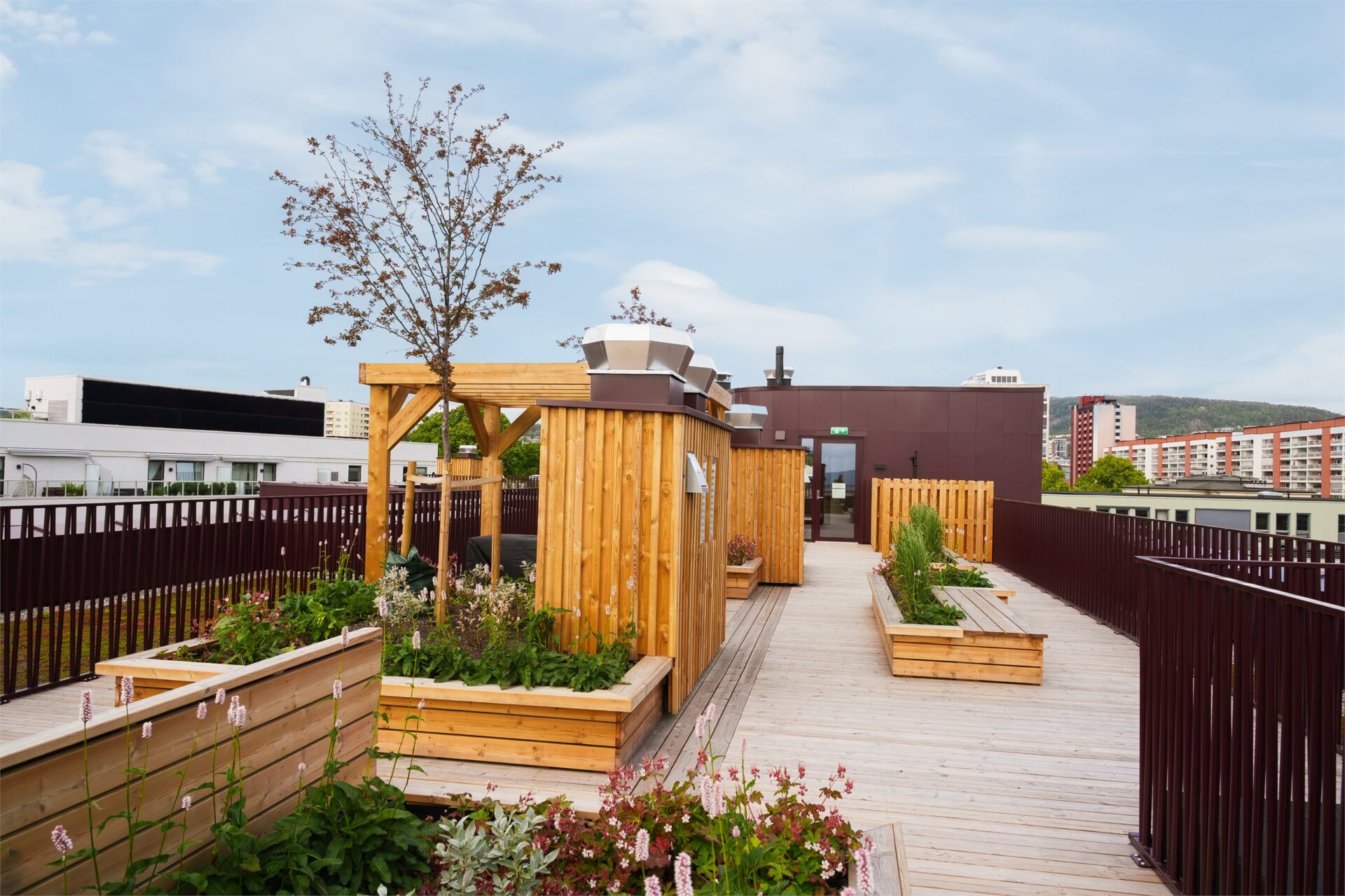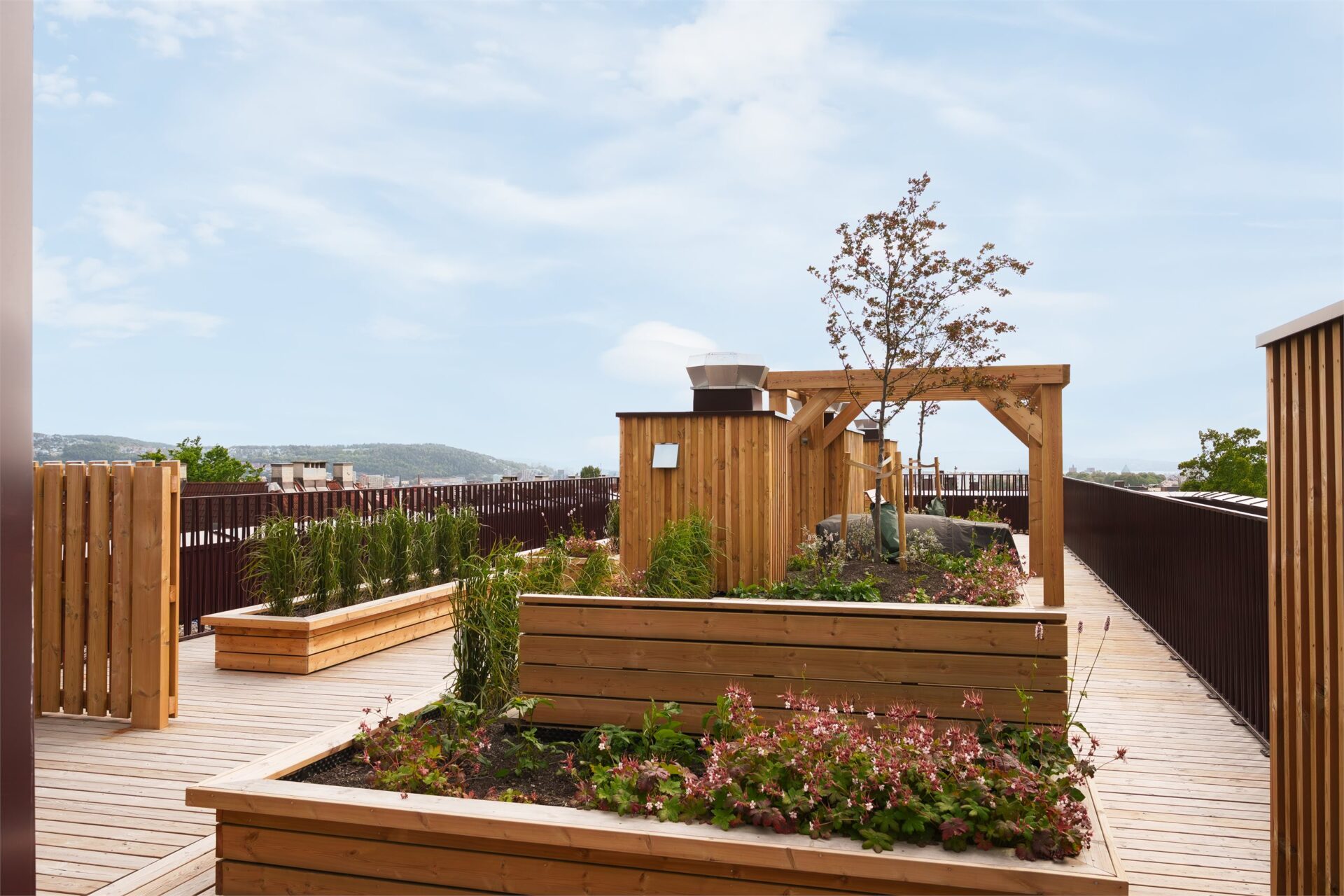 Takterrassen vil få platting i tre. Terrassen vil bli opparbeidet med plantekasser i ulike høyder og sitteområder. Det vil også bli anlagt pergola og utekjøkken. Takterrasse vil ha tilgang til HC-WC i oppgangen.