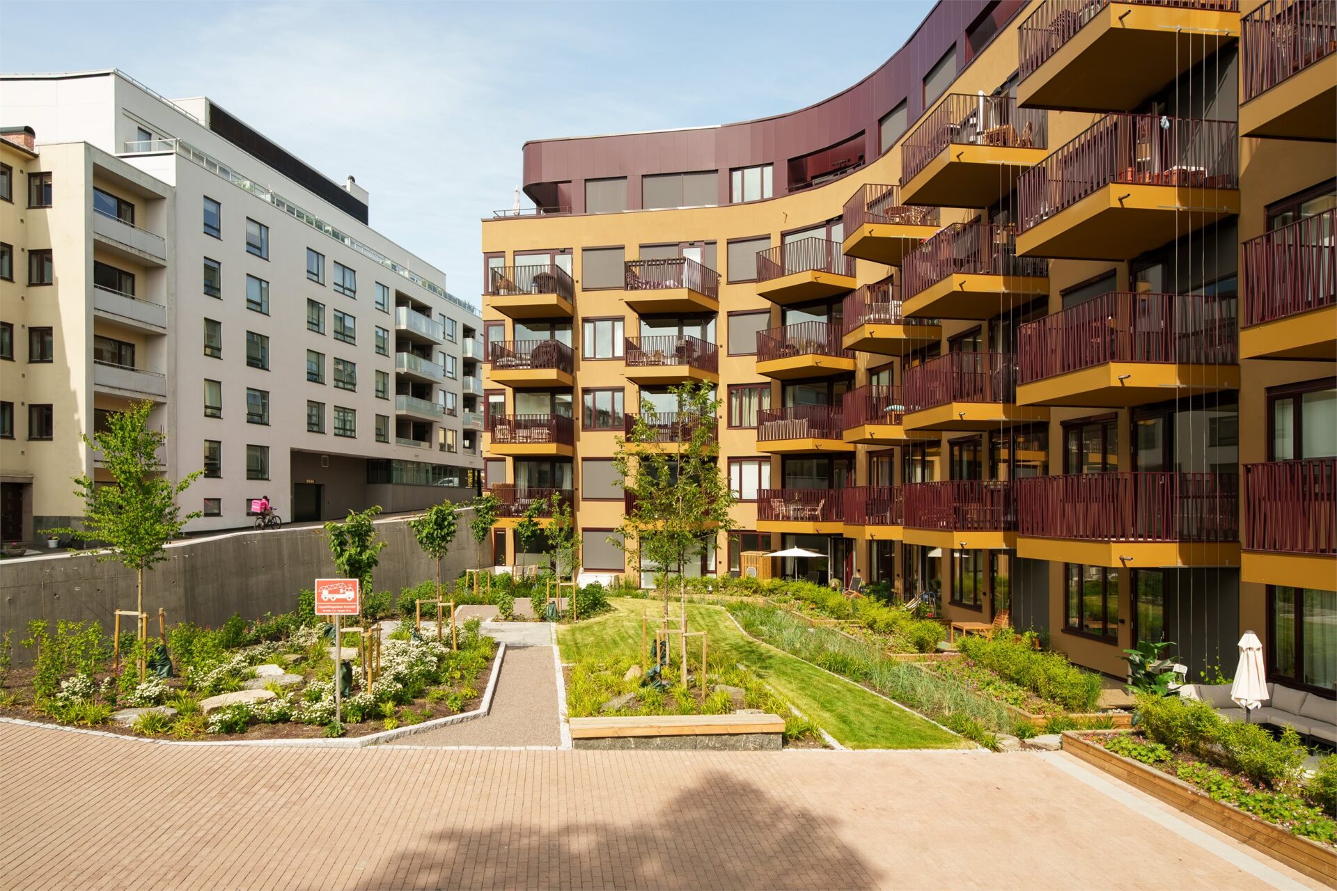Balkongene leveres enten som utenpåliggende, inntrukket eller overbygde. Det vil bli levert rekkverk i stål på alle terrasser, med unntak av markterrasser hvor avgrensning mot hage vil skje med beplantning.